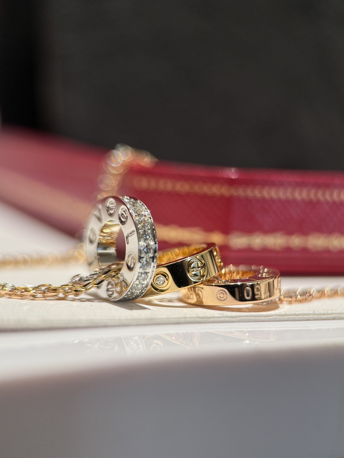 這條項鍊真的屬於那種一戴上就會被注意到的經典款。靈感來自LOVE 系列,將玫瑰金、白金、黃金三種色調巧妙融合,低調卻非常有存在感,是越看越耐看的設計。