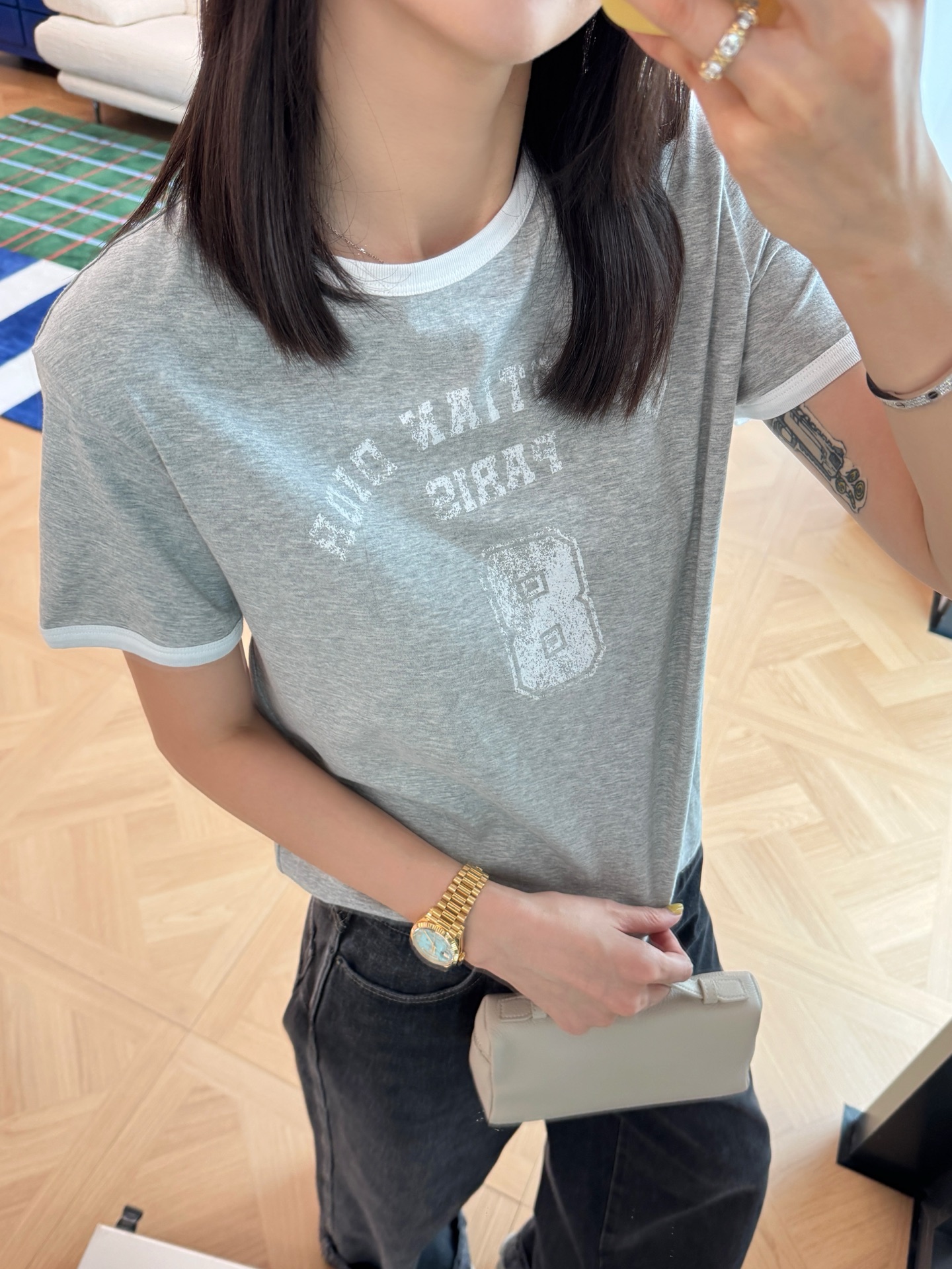這件T恤最大的魅力就在於簡單中見細節。灰白配色低調又高級,隨性穿出門都很有氣質。