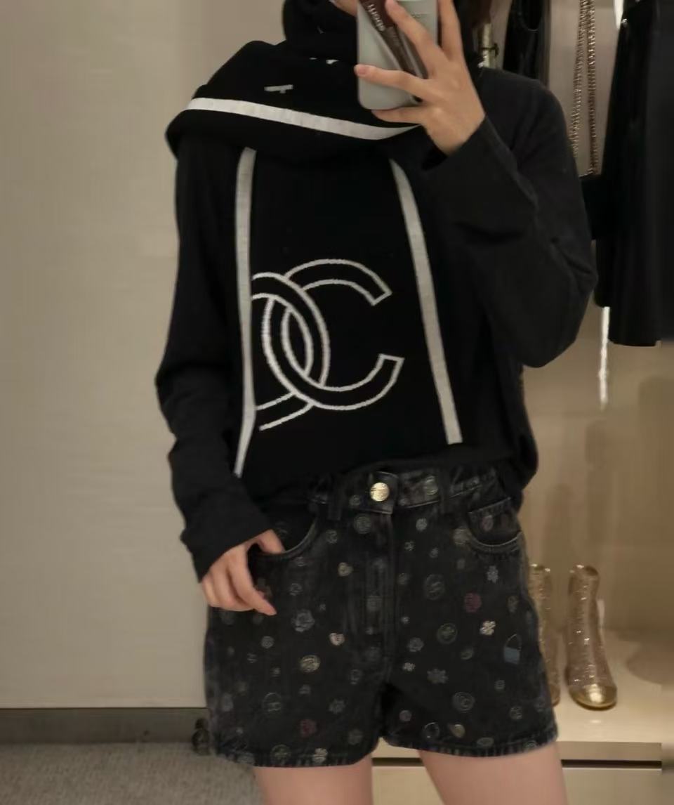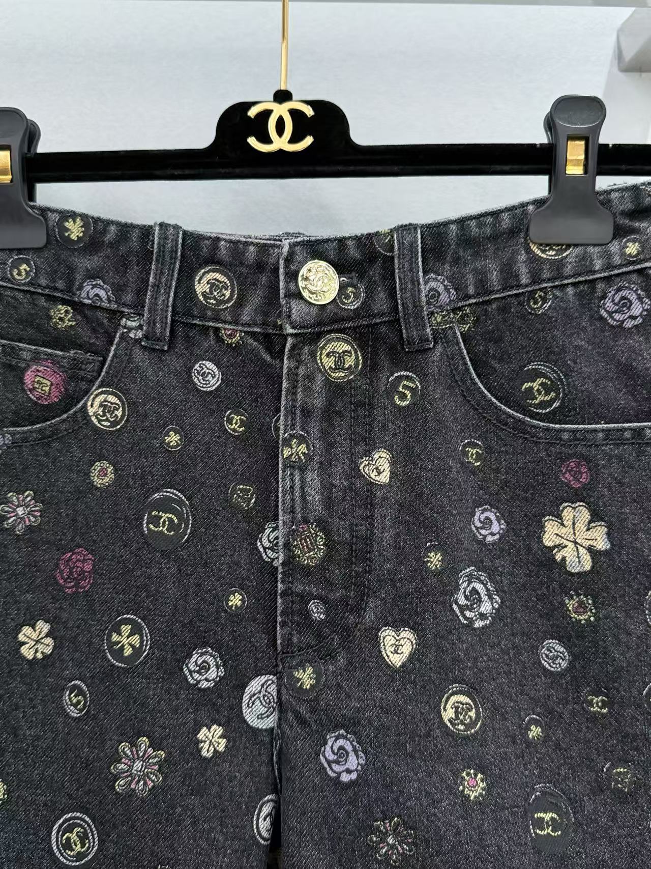 整件褲子佈滿了經典的雙 C 與山茶花元素,卻因為黑灰色的多重做舊工藝,顯得低調帥氣而不失高級感。