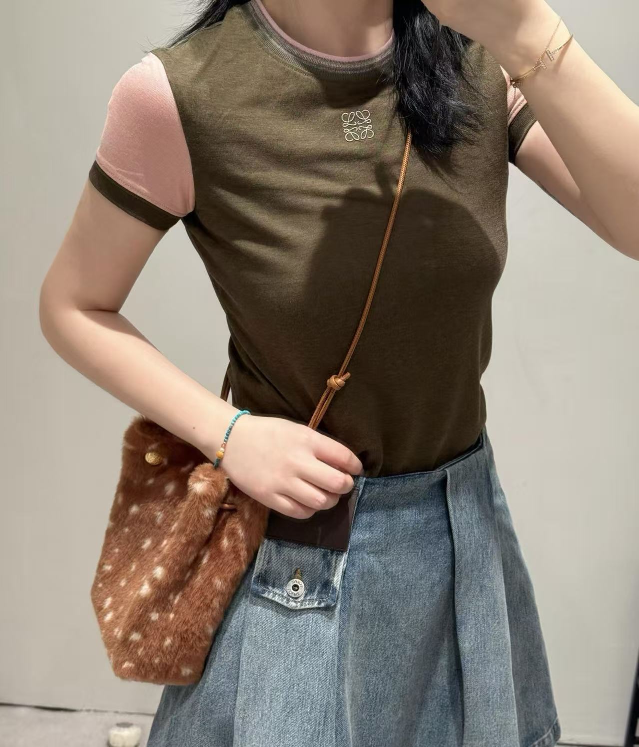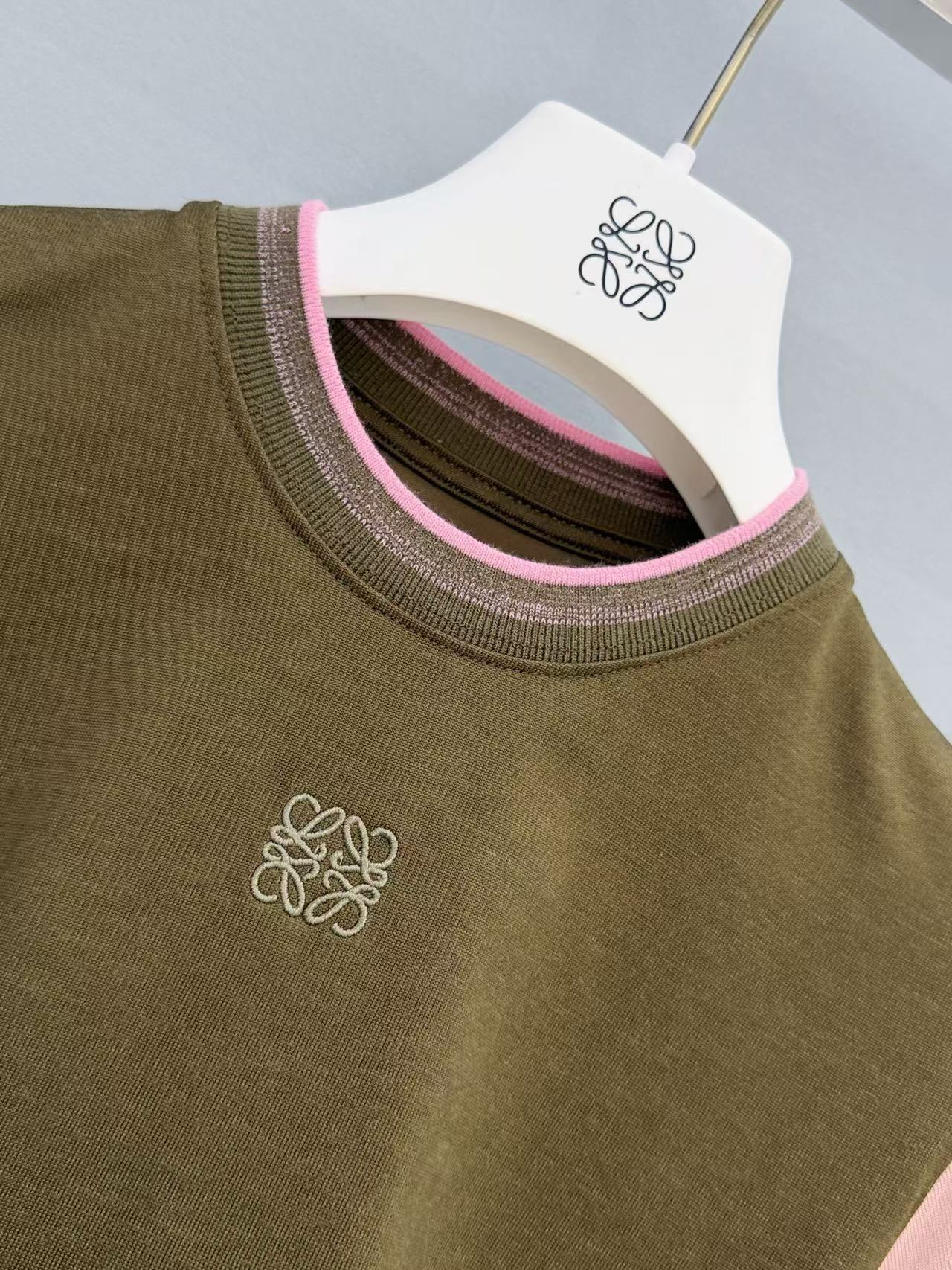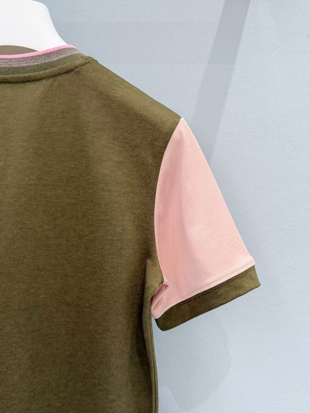 主體的卡其綠結合袖口的櫻花粉,打破了單色 T 恤的沉悶,讓整個人看起來既有質感又充滿活力的律動感。
