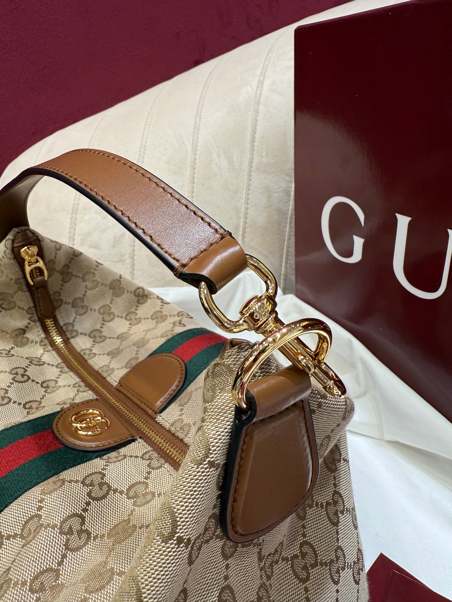 包身採用米色與棕色 GG 帆布,搭配棕色皮革滾邊,耐看又耐用。