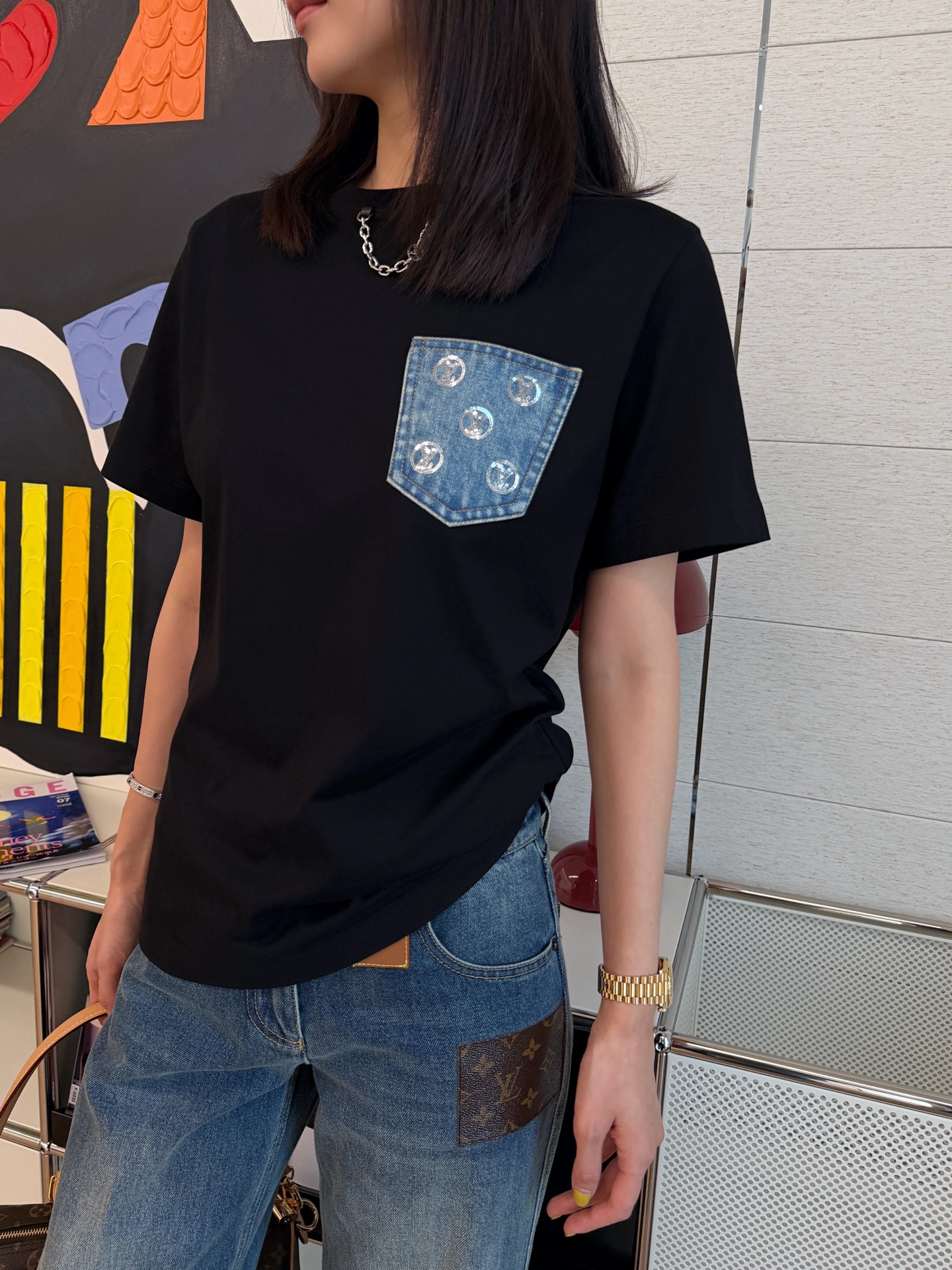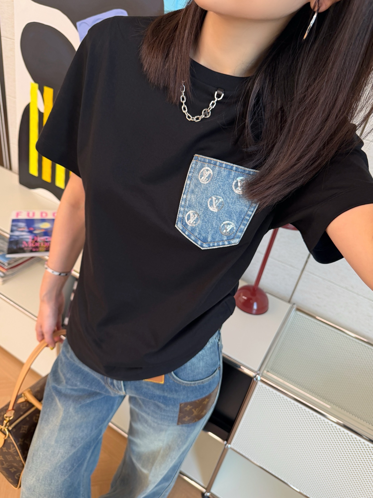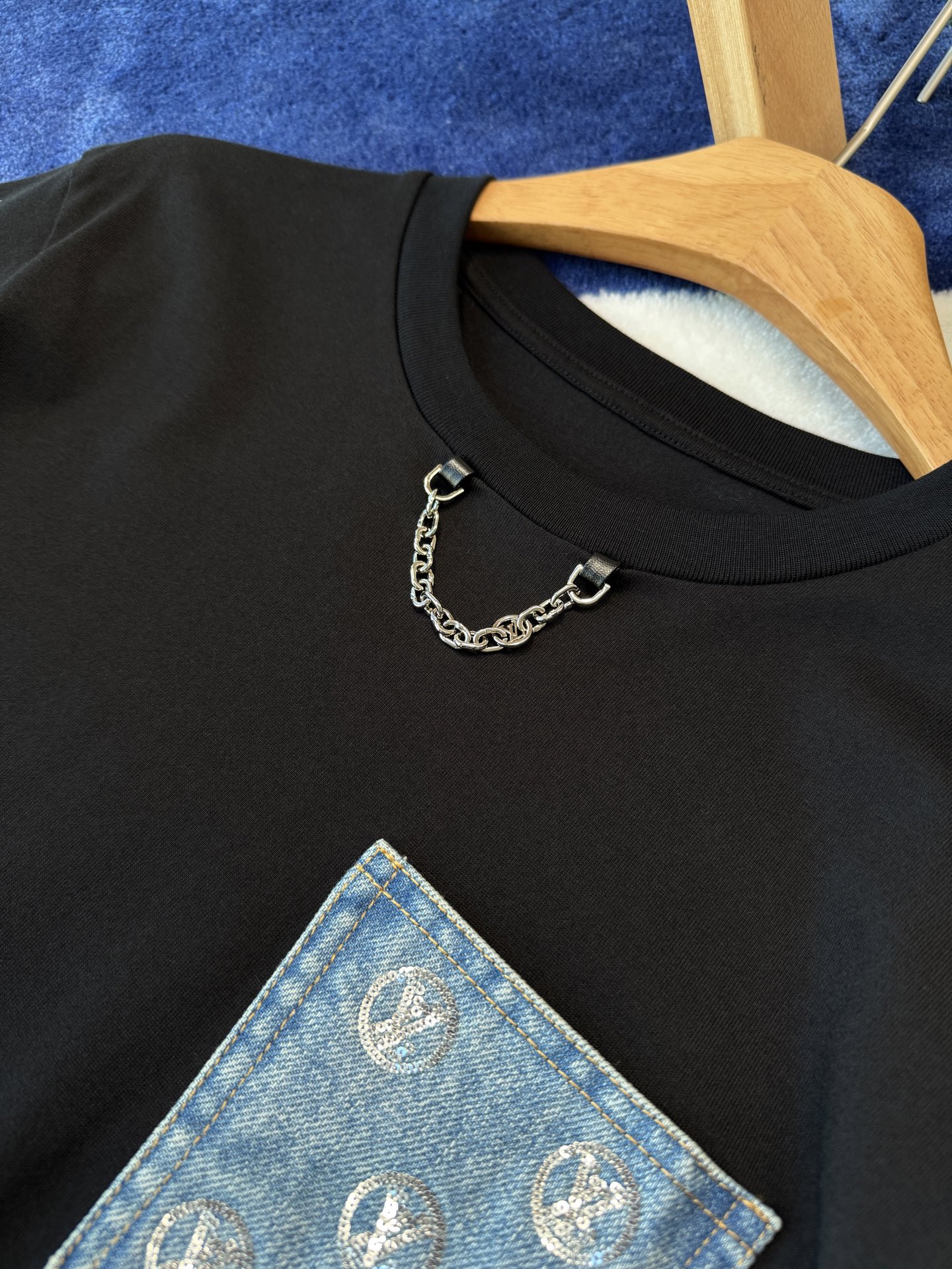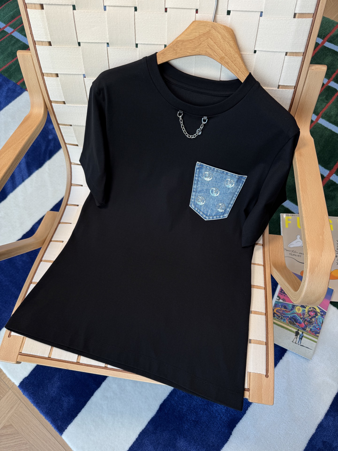 胸前的丹寧口袋+珠片點綴 是這件的亮點,看似低調,卻悄悄提升整體精緻度,讓基礎款多了一點亮眼細節。