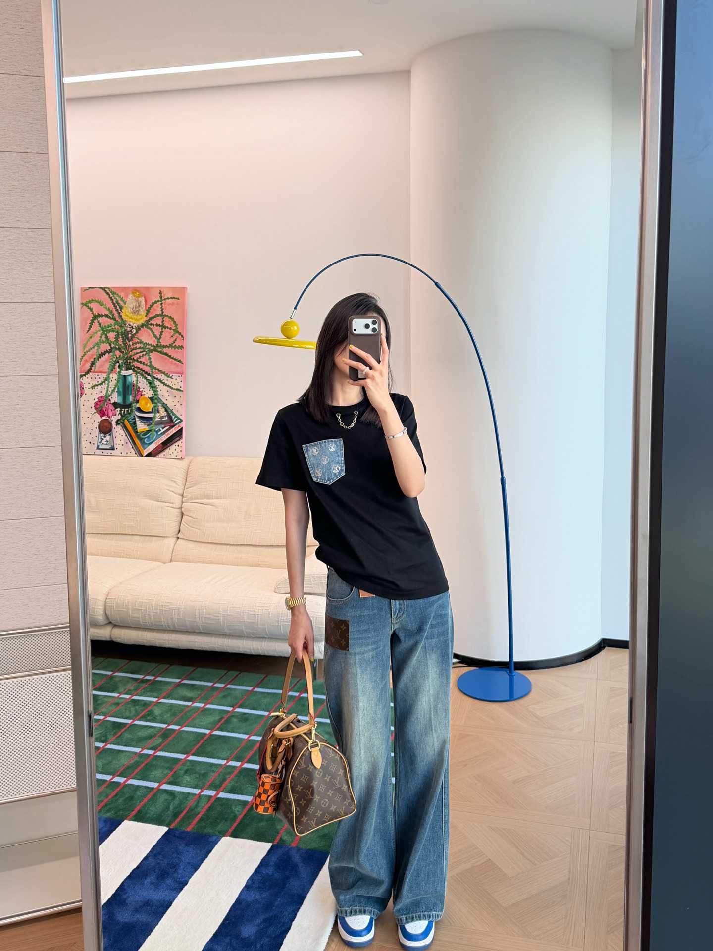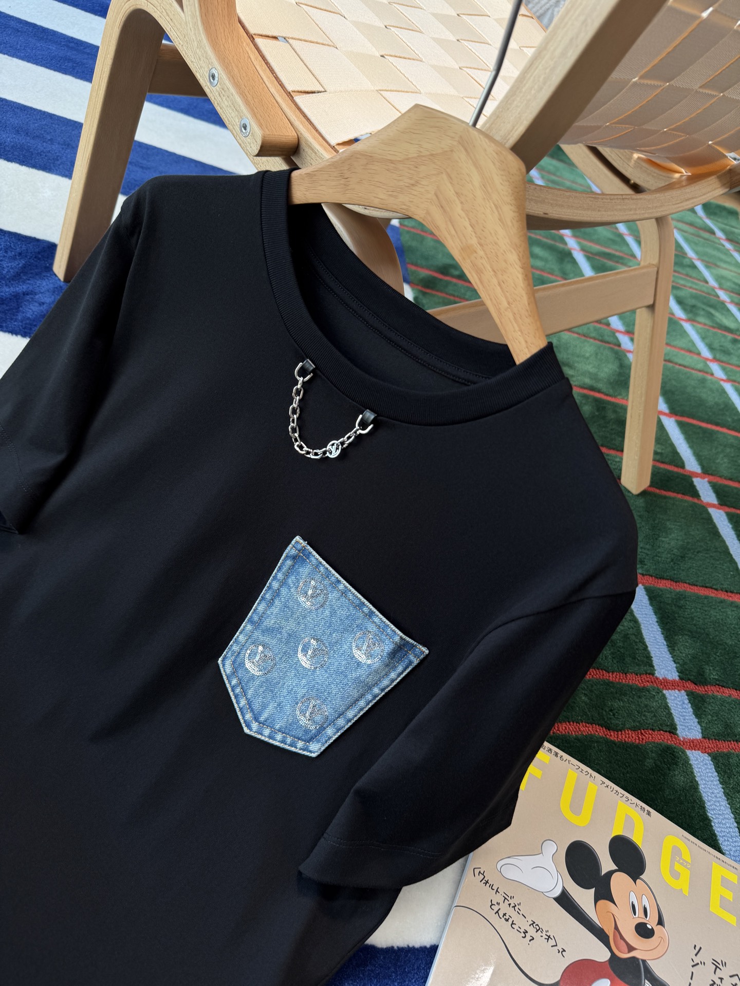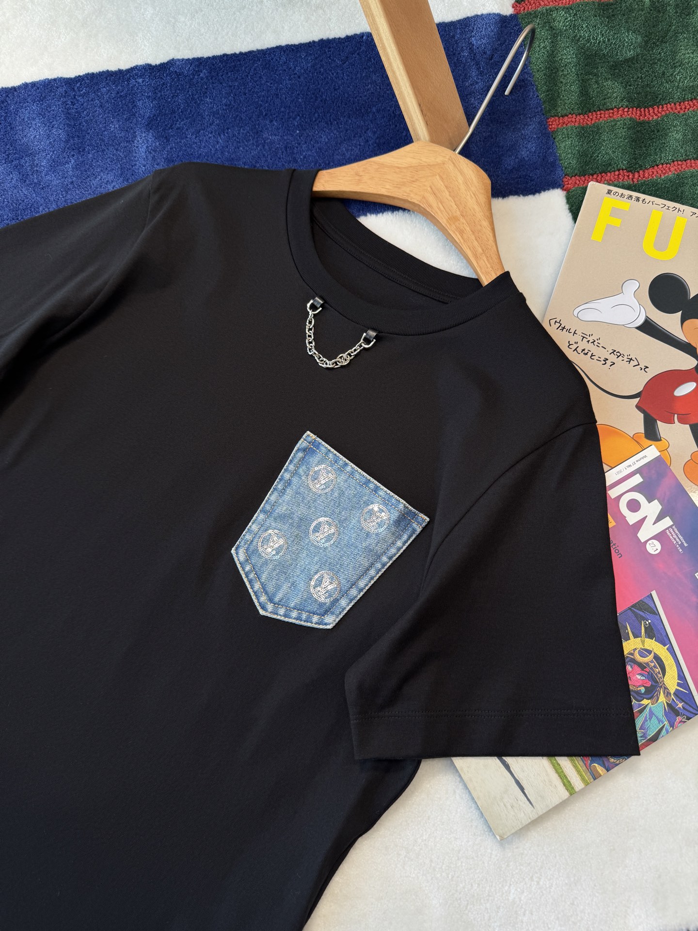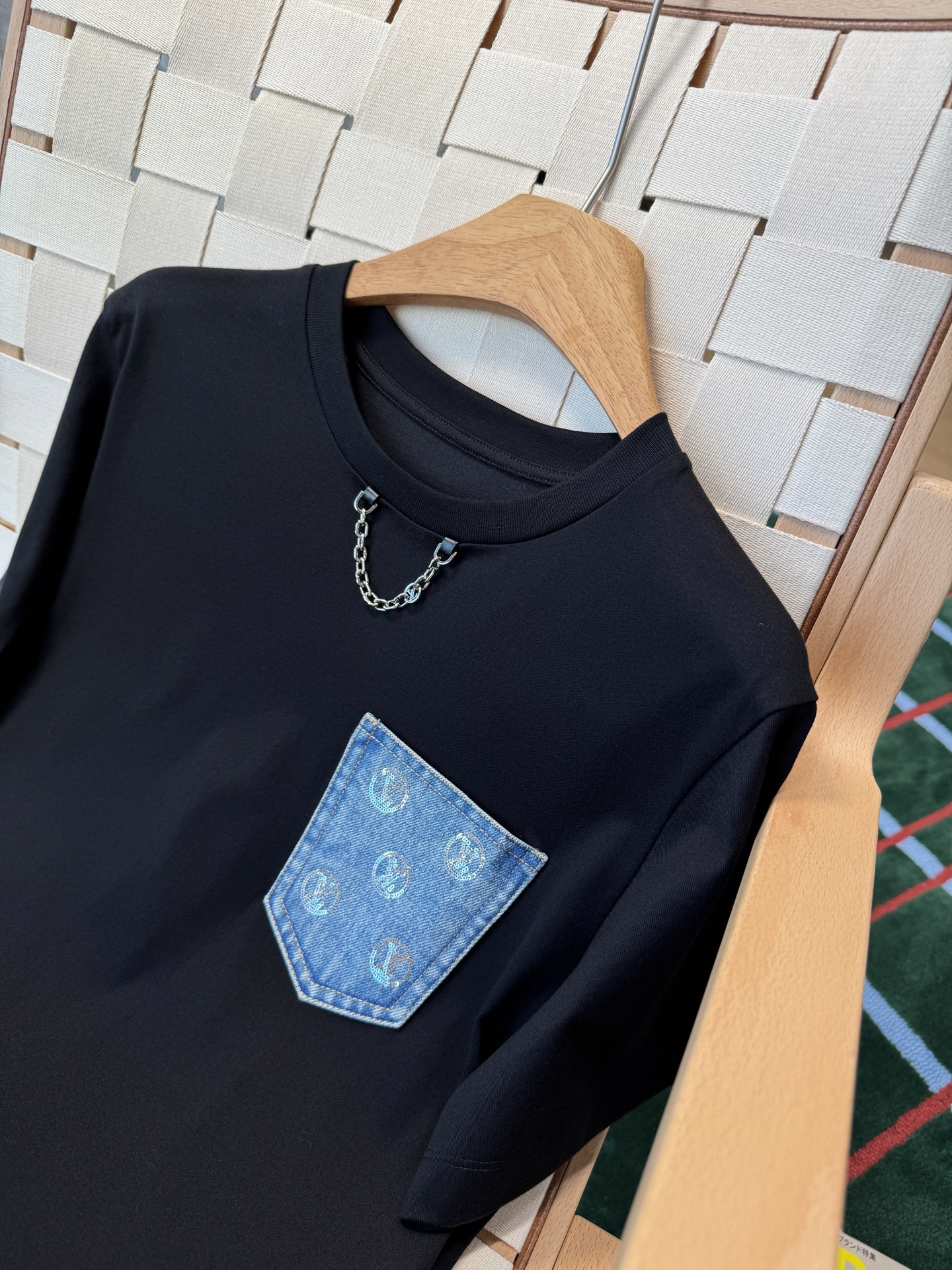 胸前的丹寧口袋+珠片點綴 是這件的亮點,看似低調,卻悄悄提升整體精緻度,讓基礎款多了一點亮眼細節。