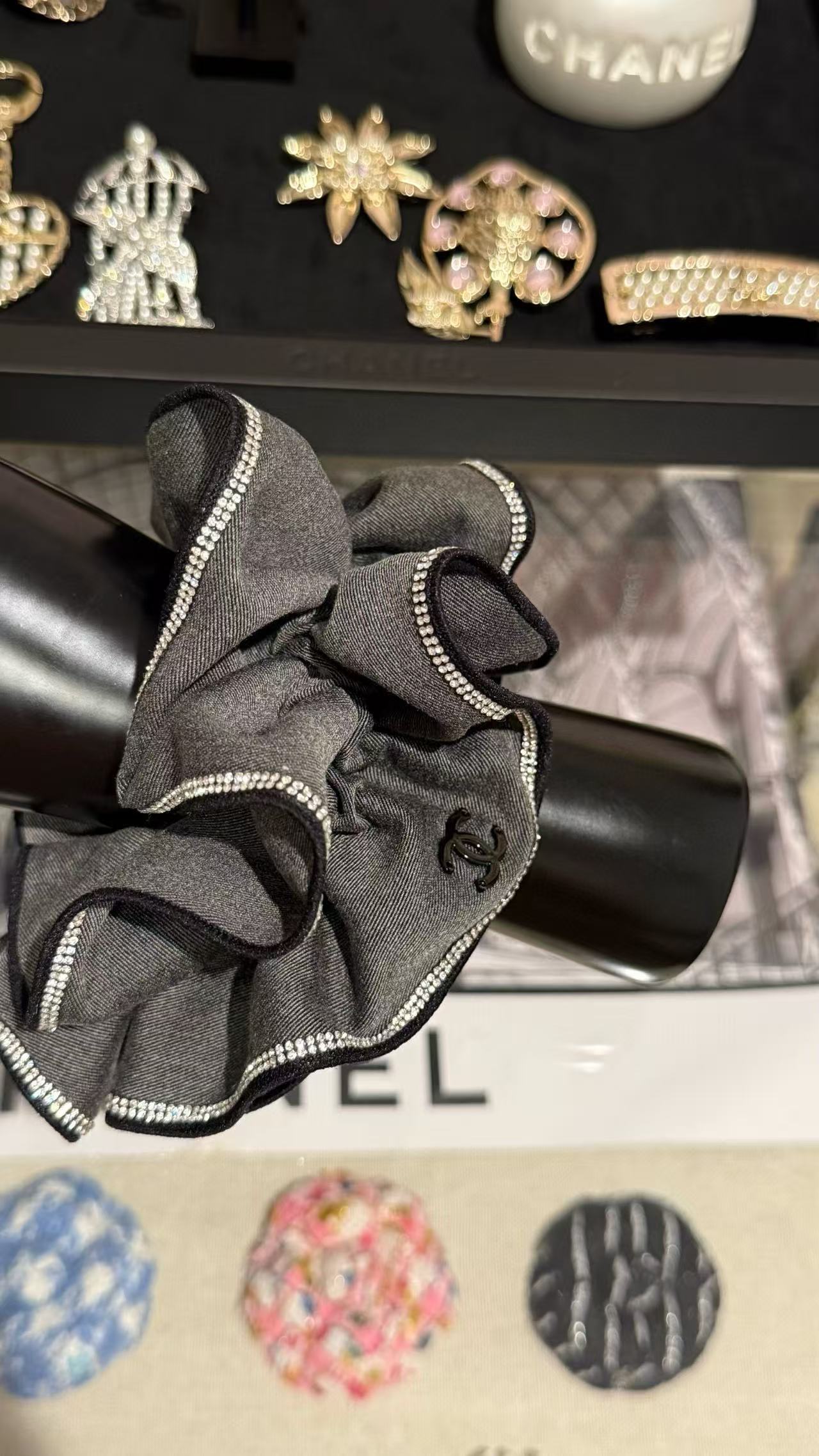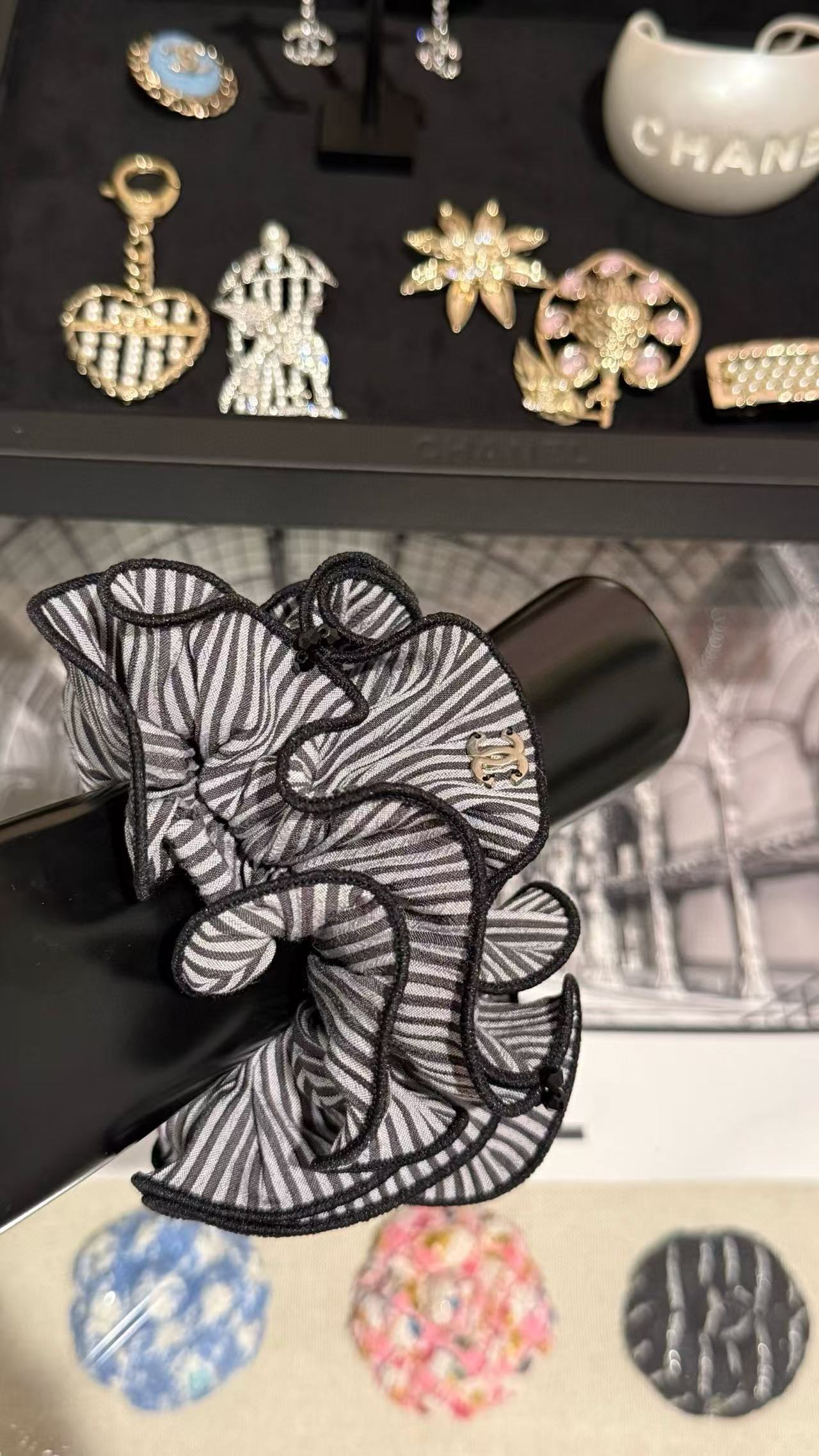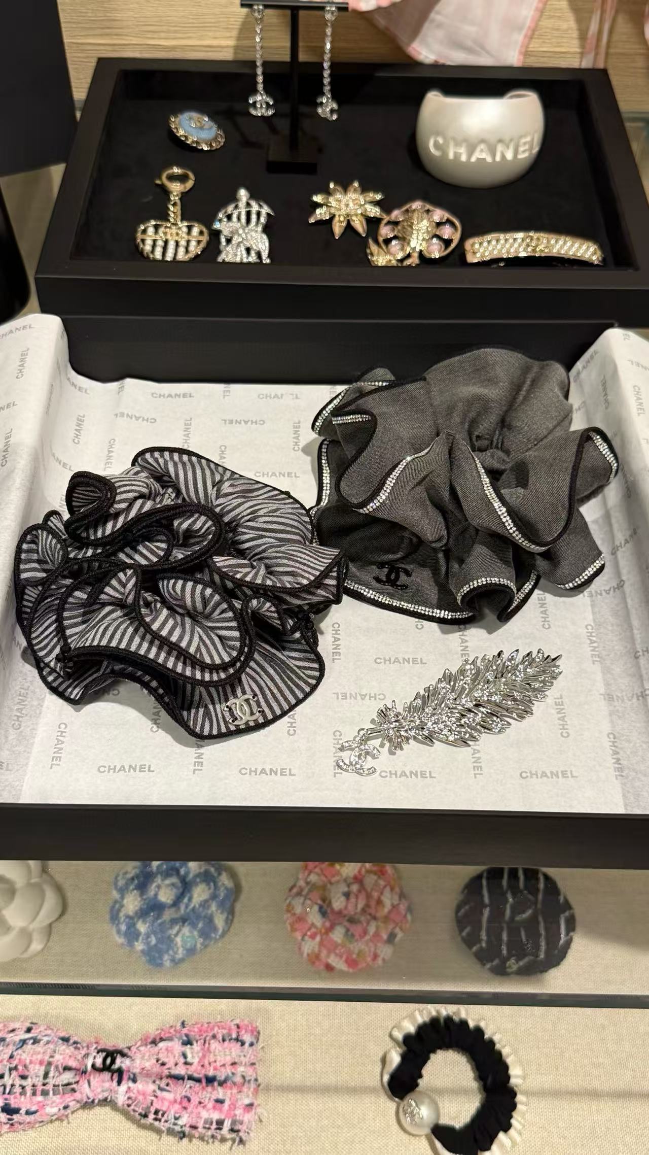 這系列髮圈以浪漫荷葉邊設計為亮點,柔美線條襯托 C家標誌性雙C logo,散發法式優雅氣息。