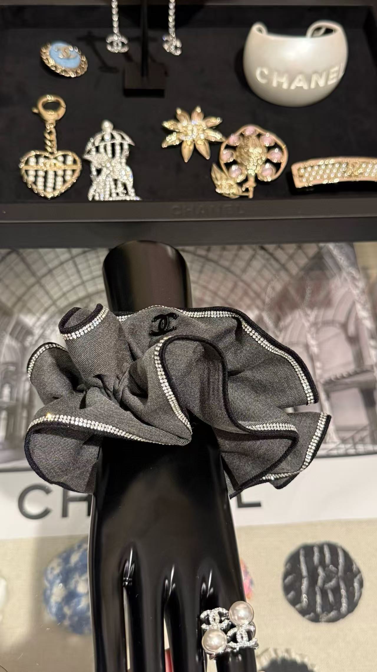 以高質感灰色西裝料為基底,鑲嵌細緻排鑽封邊,黑色雙C logo 增添經典黑白對比。