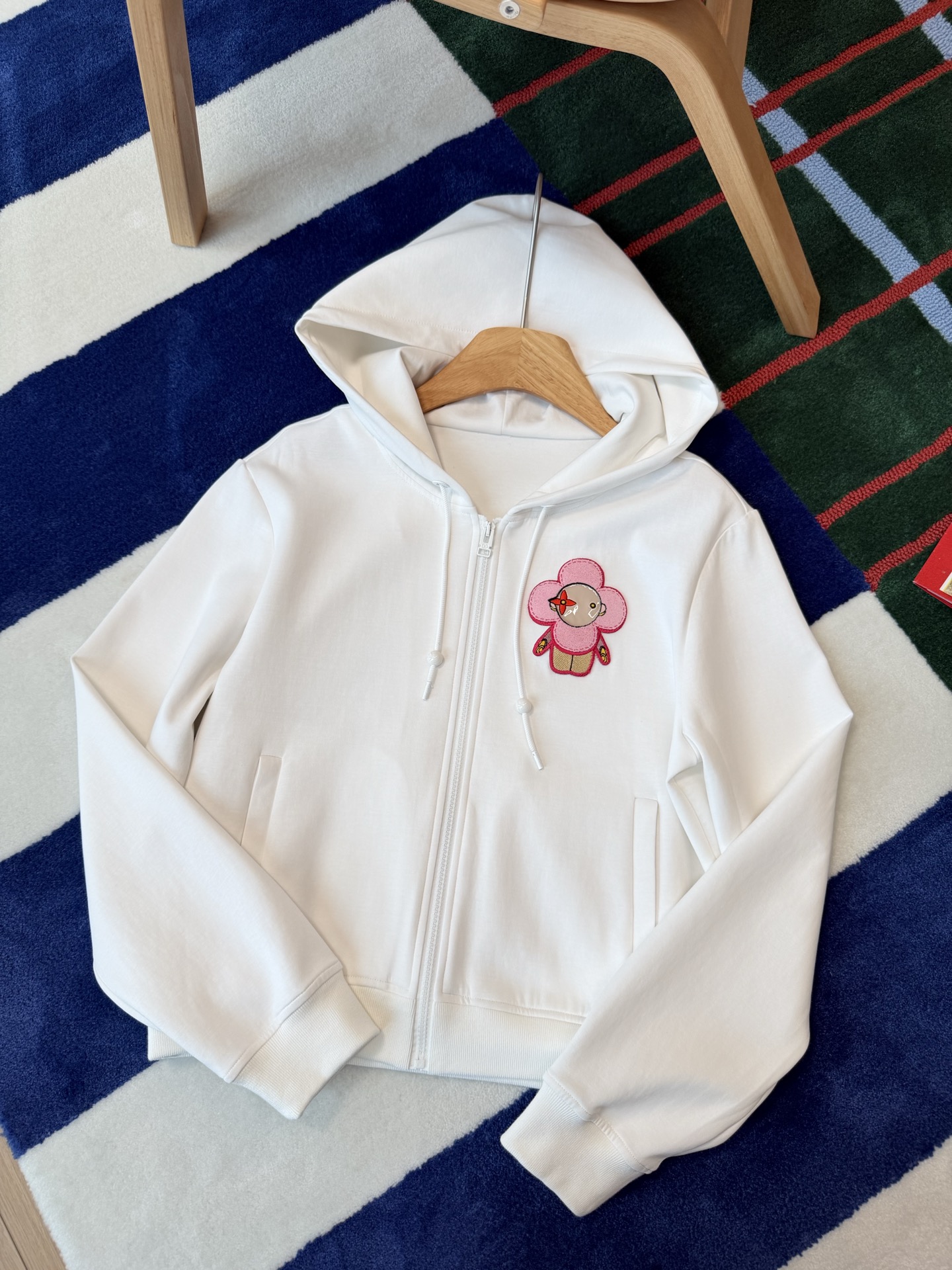 胸前點綴的花朵貼布刺繡,替整體增添一點可愛與細節亮點,不會過於甜膩,反而多了一點個性。