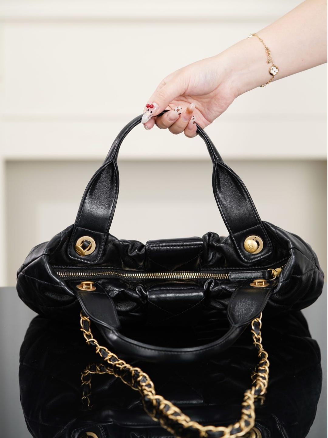 皮穿鏈條延續品牌經典設計,雙 C 字母刻印清晰立體,整體質感極高。
