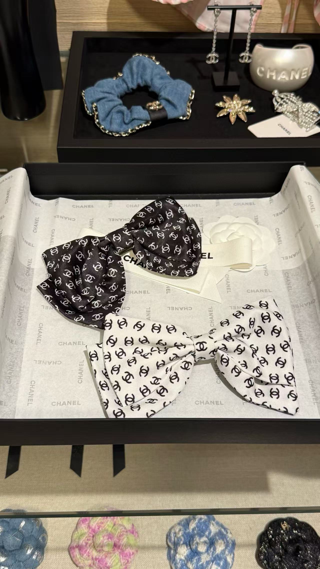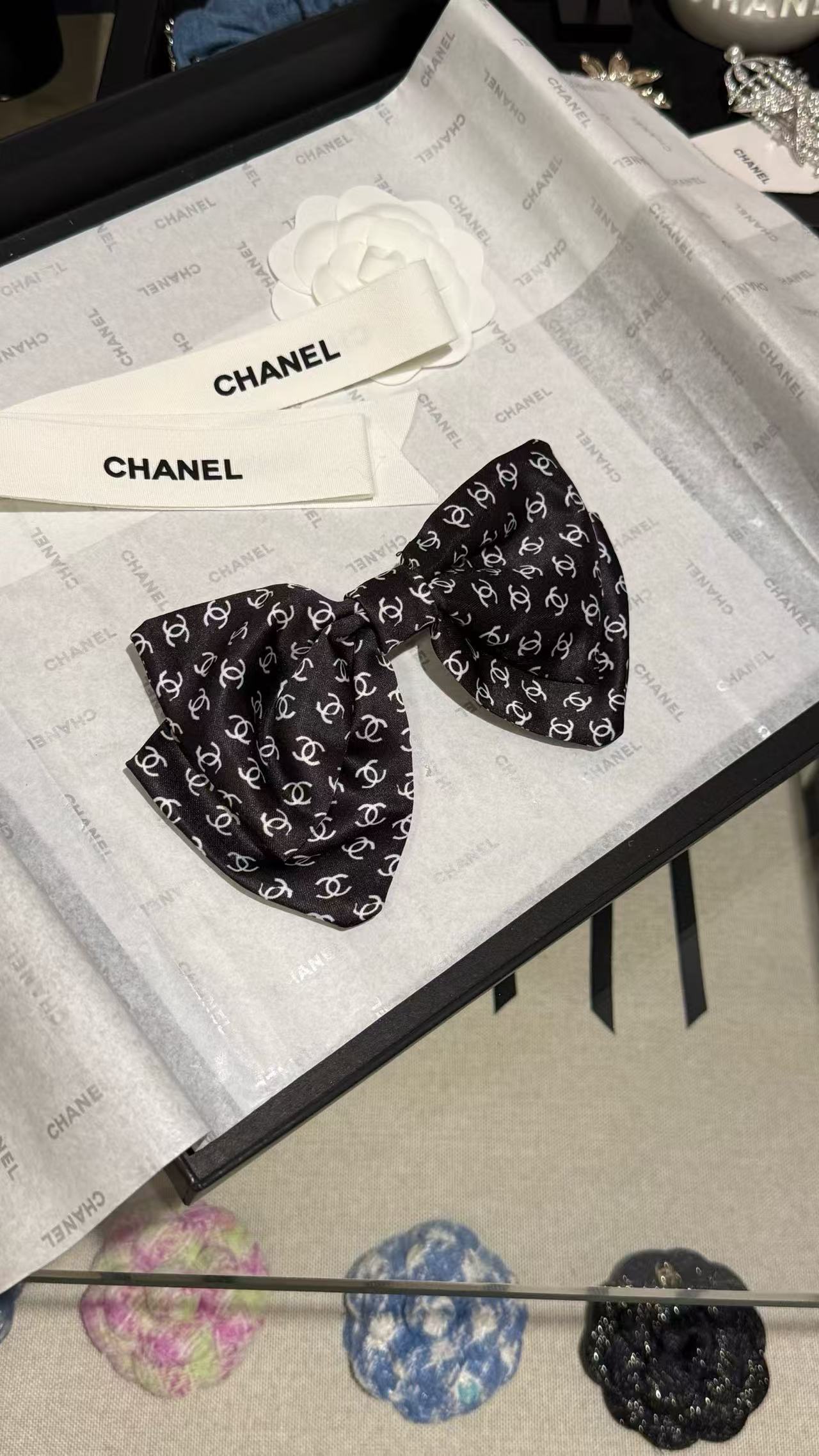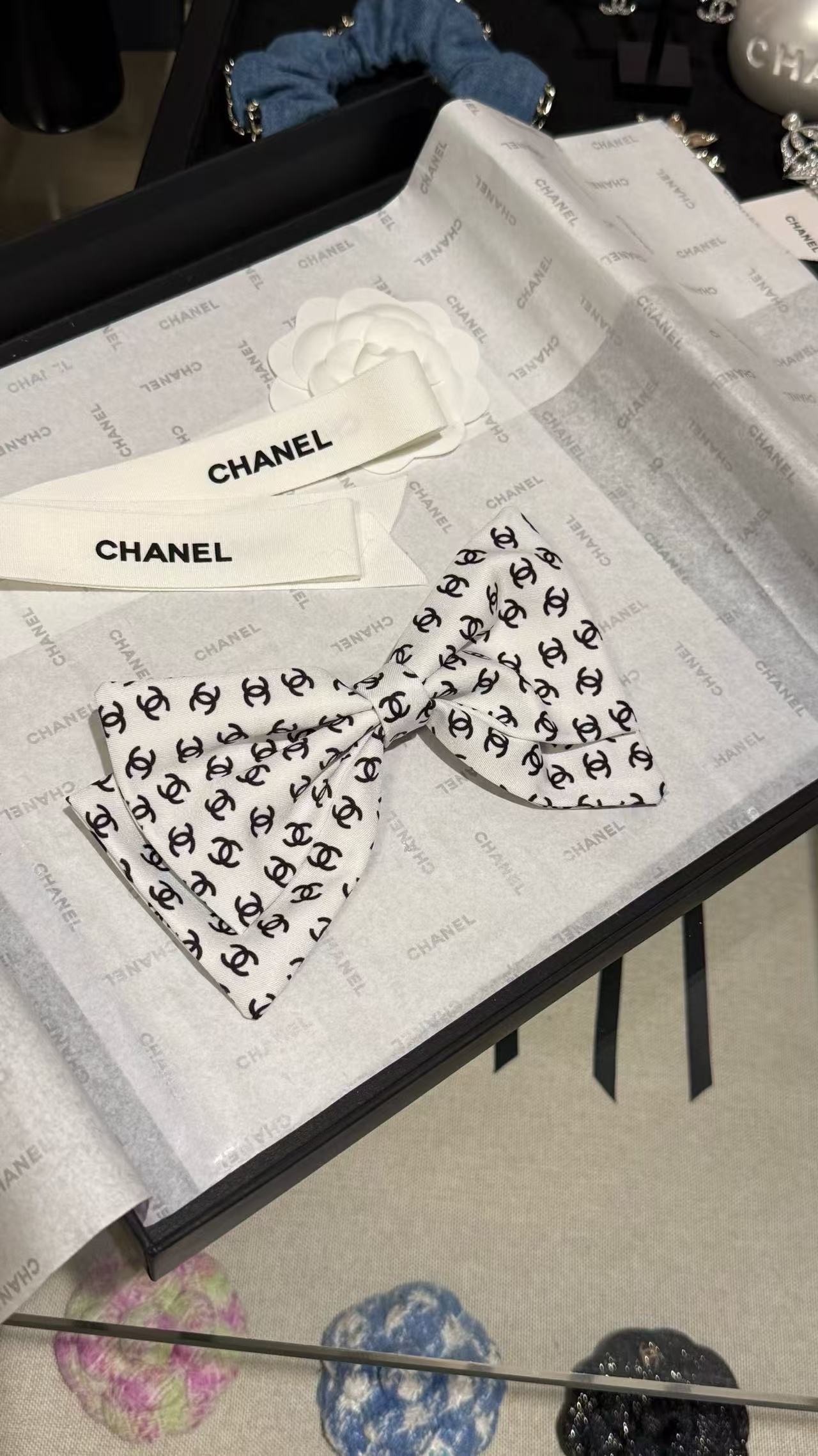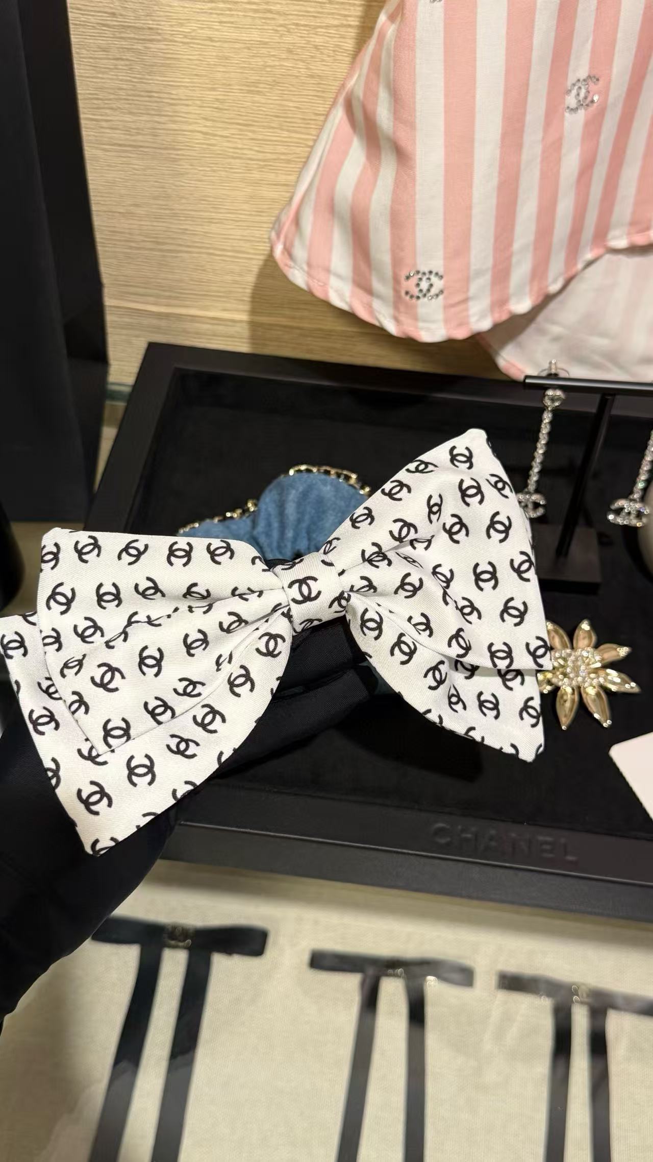 將品牌經典元素與蝴蝶結設計巧妙結合,優雅中帶著俏皮,貴氣又時髦。黑白配色簡約耐看,滿印雙 C 圖案盡顯品牌辨識度,