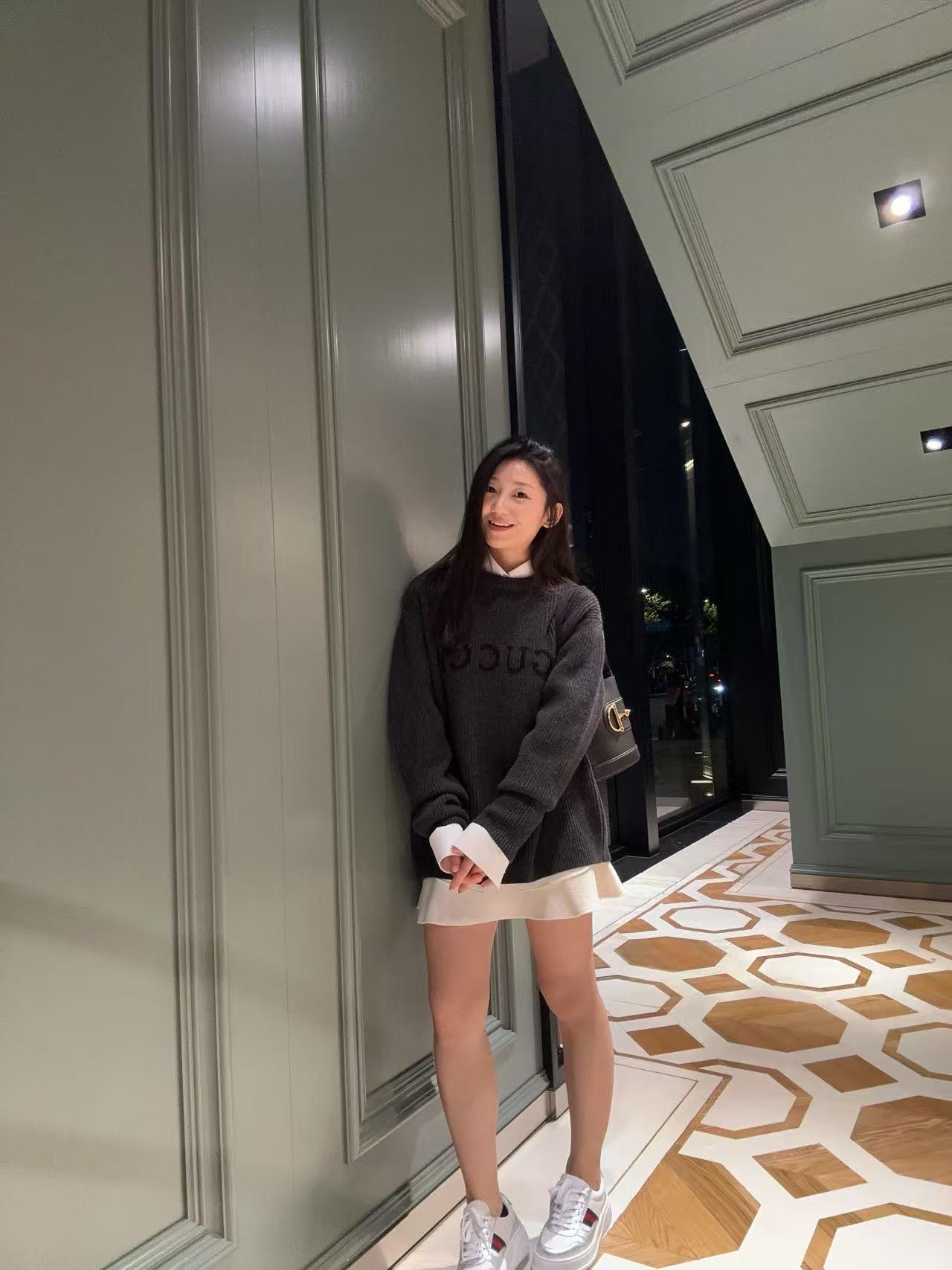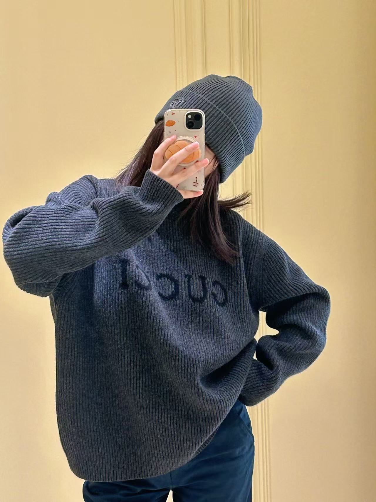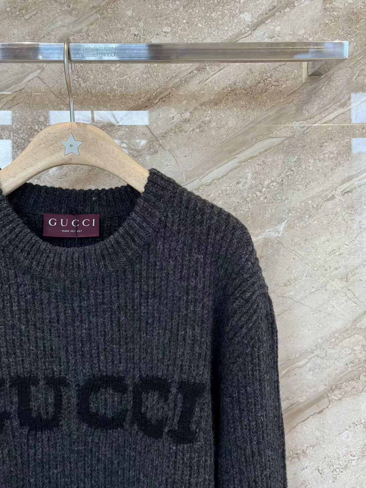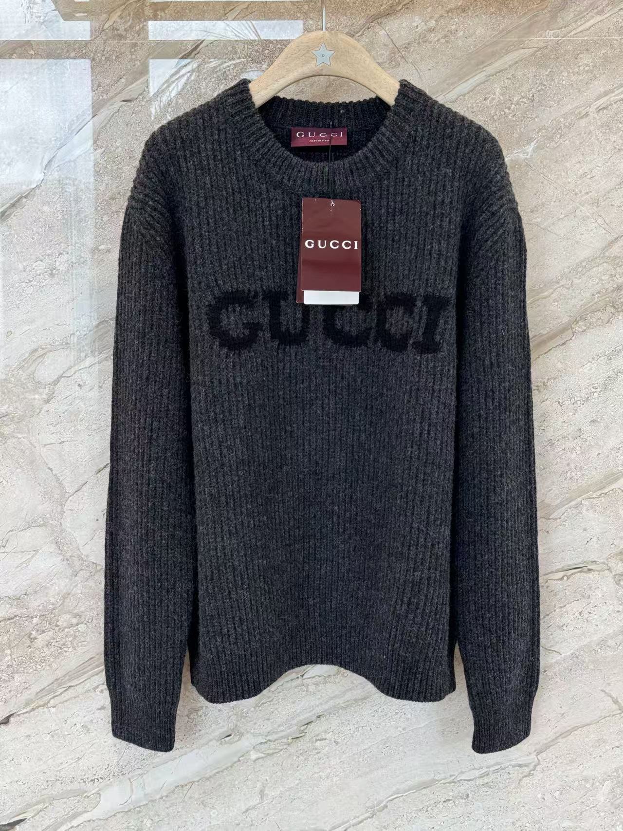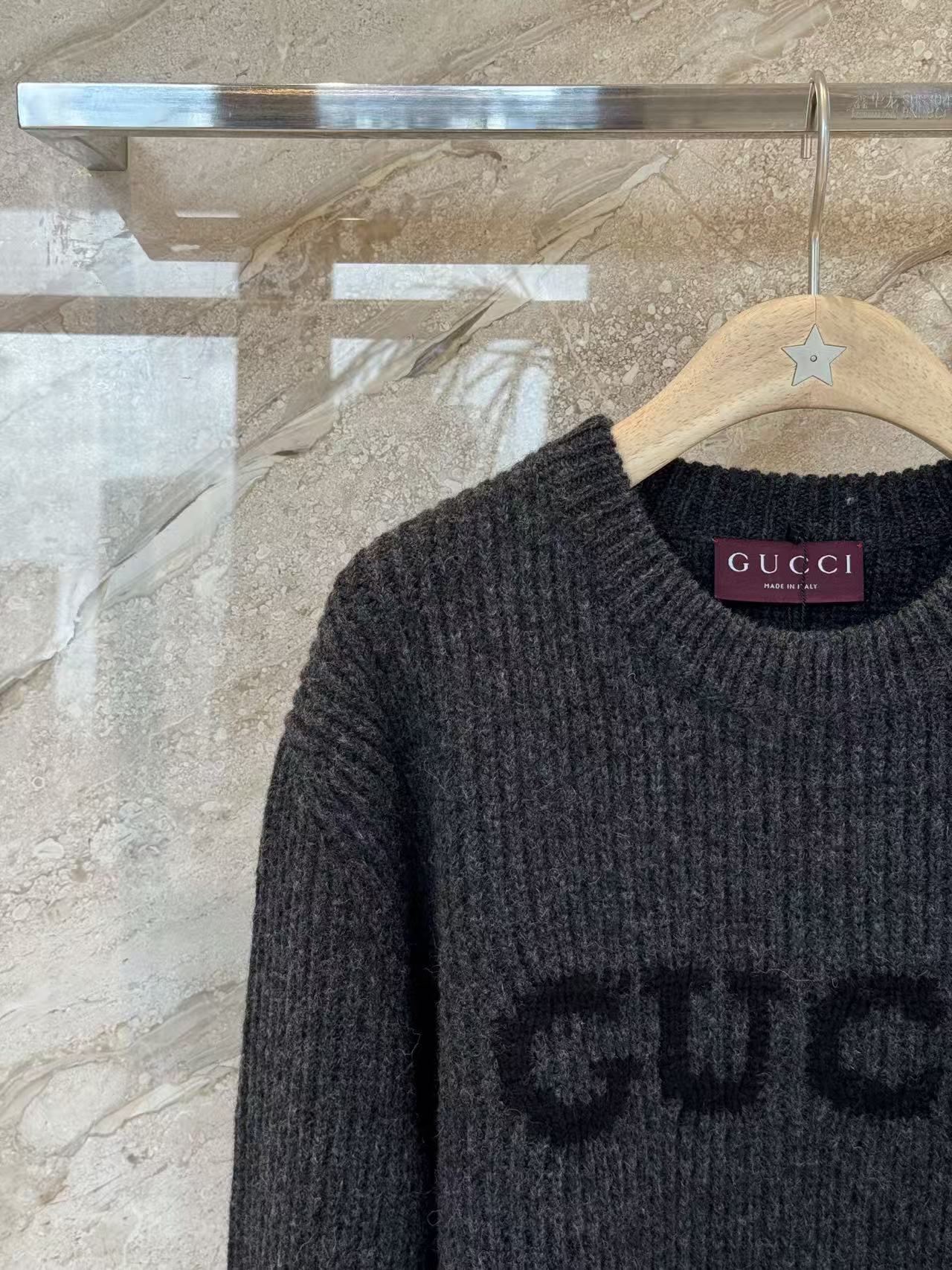 宋威龍同款深灰色粗針織,一眼看過去低調沉穩,胸前黑色GG字母提花超有辨識度,隨性中帶點貴氣,低調好看~