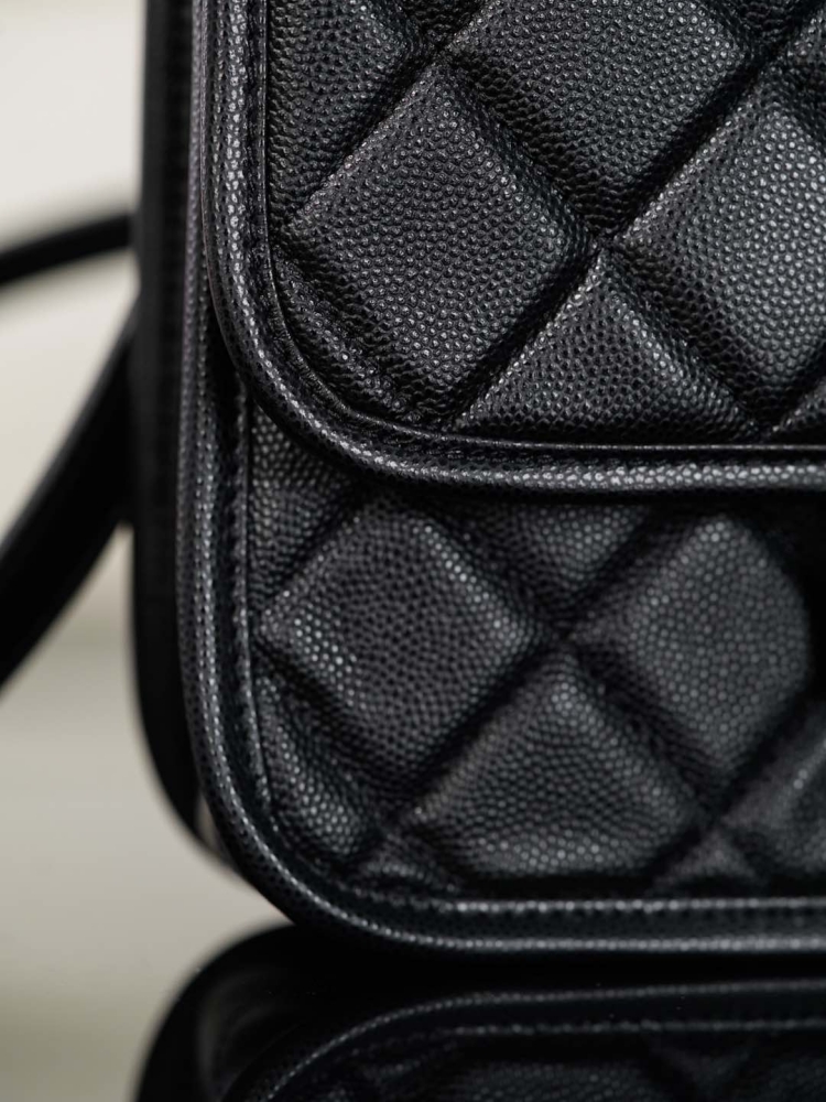 嚴選獨家原廠 HAAS 魚子醬荔枝牛皮,硬挺度高、紋理細緻,讓包型更加立體俐落,完全不同於一般休閒款的鬆軟感。包邊圓潤流暢,每一個菱格弧度均勻一致,細節精緻到位。