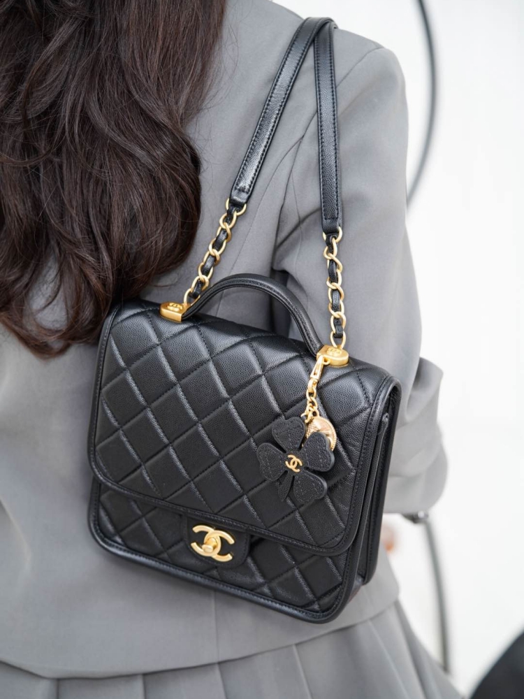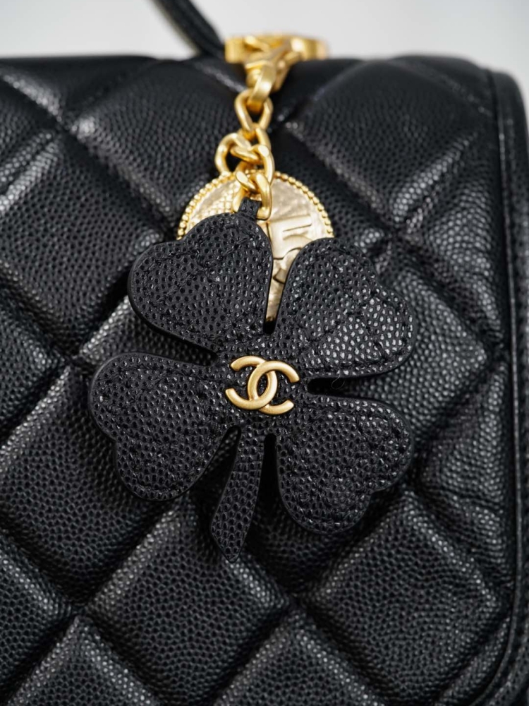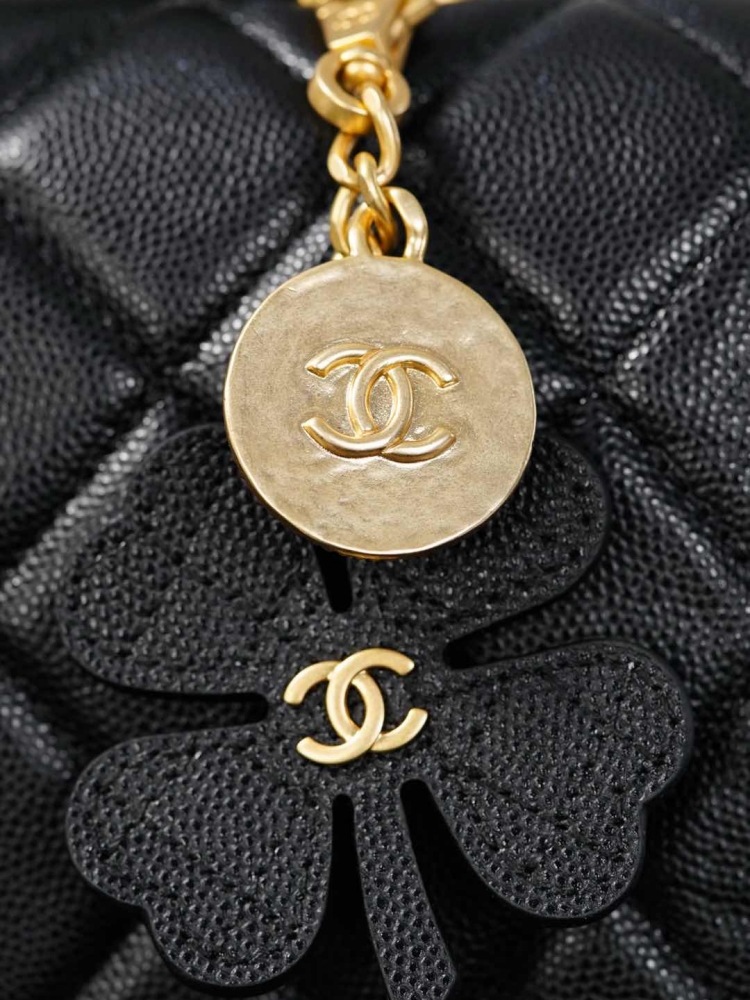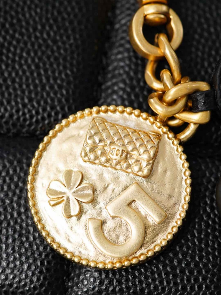 四葉草勳章吊墜是靈魂亮點,將菱格包、No.5 香水符號、雙C經典元素結合在一起,透過做舊處理和砂金質感,散發濃厚的復古氛圍。五金選用純銅砂金工藝,份量與細節都帶出高奢感。