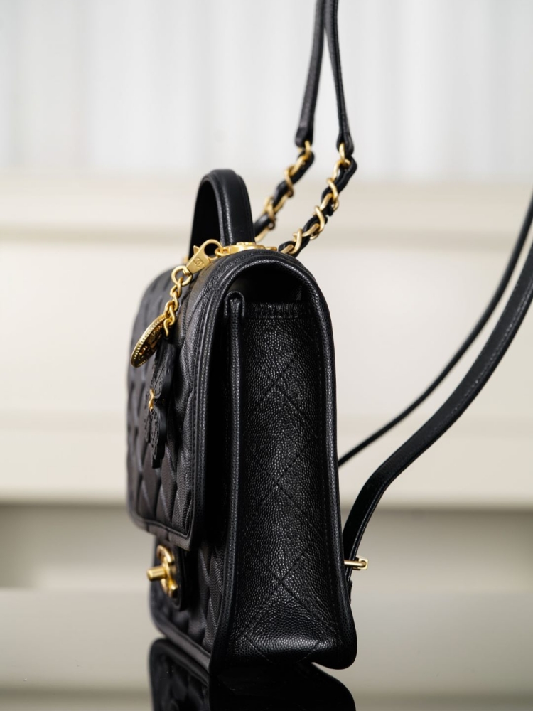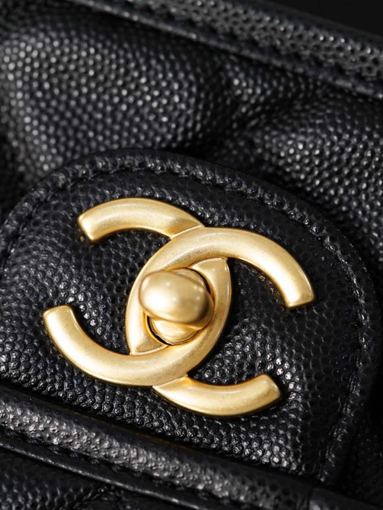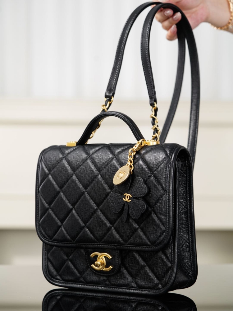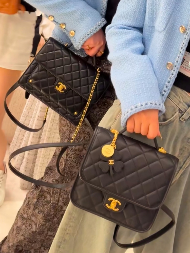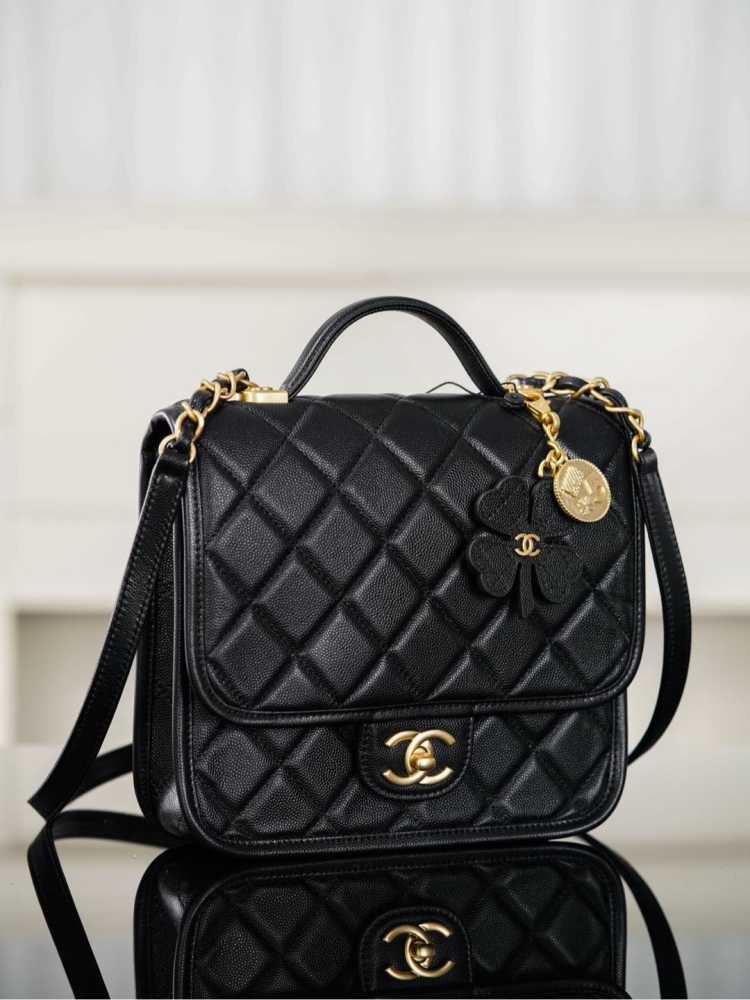 四葉草勳章吊墜是靈魂亮點,將菱格包、No.5 香水符號、雙C經典元素結合在一起,透過做舊處理和砂金質感,散發濃厚的復古氛圍。五金選用純銅砂金工藝,份量與細節都帶出高奢感。