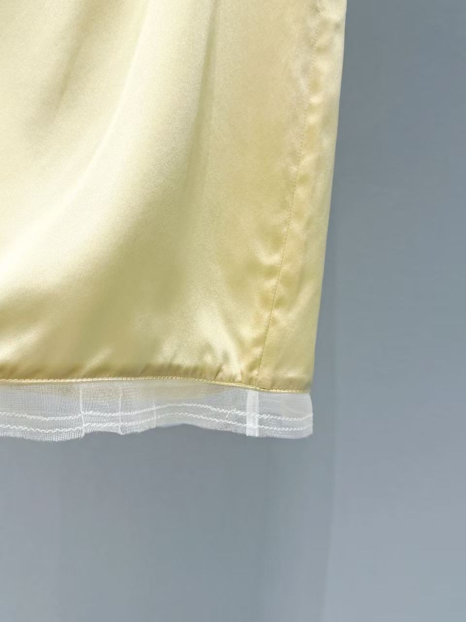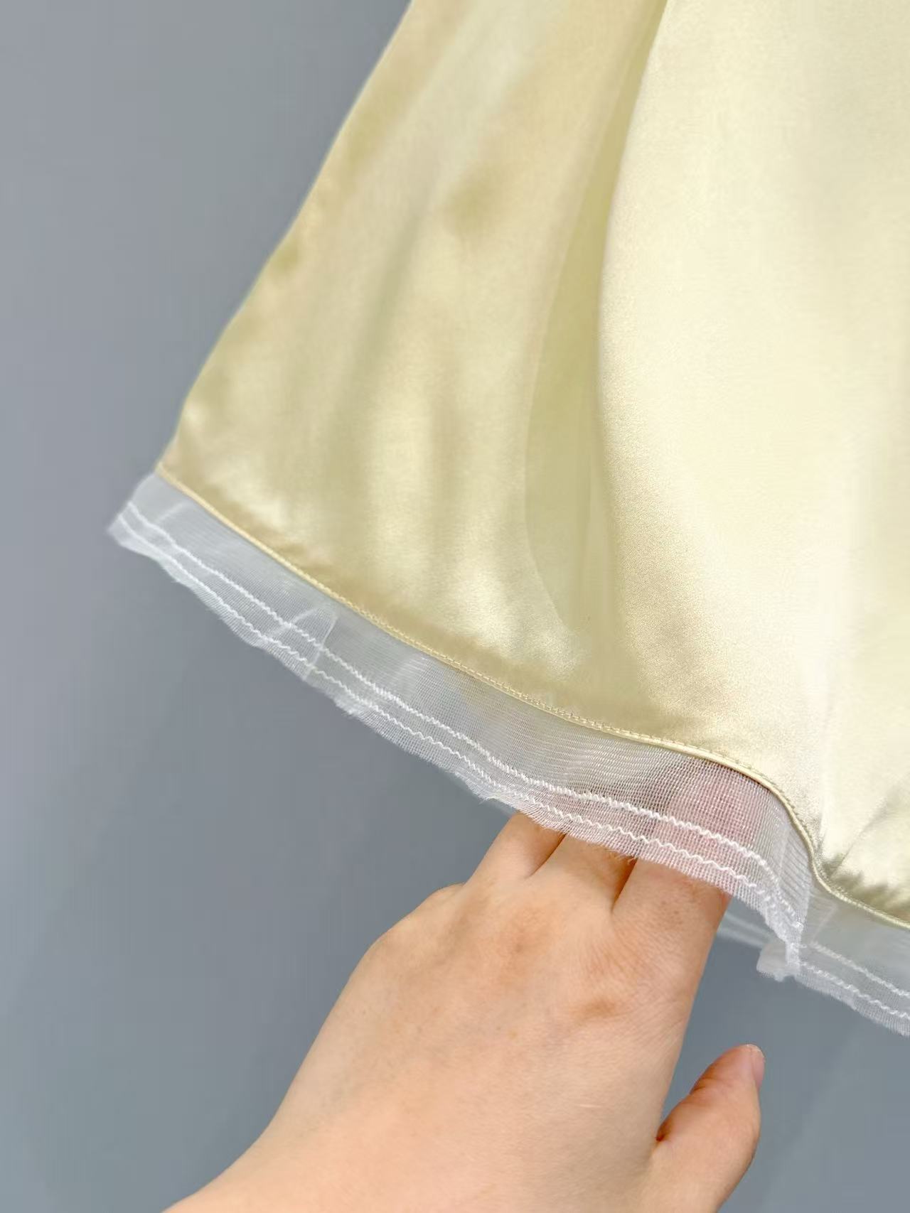 工藝特色: 裙襬飾有細緻蕾絲拼接,光澤度飽滿且手感絲滑。