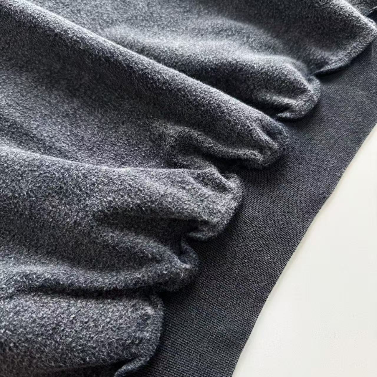 顏色走定織定染洗水褪色灰,成衣再下炒鹽機——面料跟粗鹽高溫翻滾,鹽粒均勻摩擦吸走染料,褪色不過度又帶自然磨白,邊緣輕微泛白,整體過渡柔和,像穿了幾年卻依然乾淨的老衣,復古味撲鼻而來。