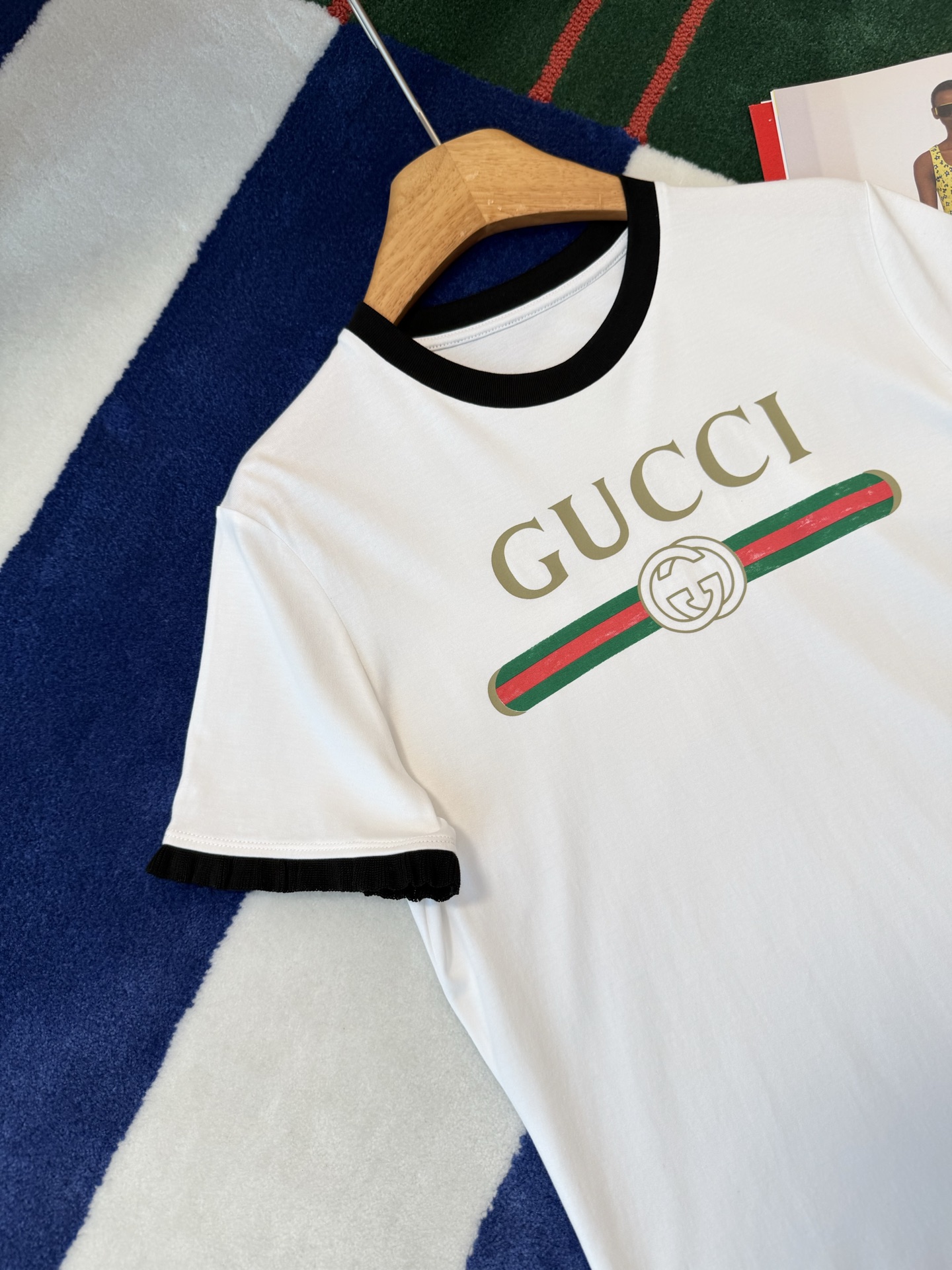 這款經典撞色設計短袖,真的會讓人一穿就愛上。以復古紅綠織帶搭配經典雙G印花,整體氛圍帶點復古韻味,同時又保有現代時尚的俐落感,簡單卻不單調。