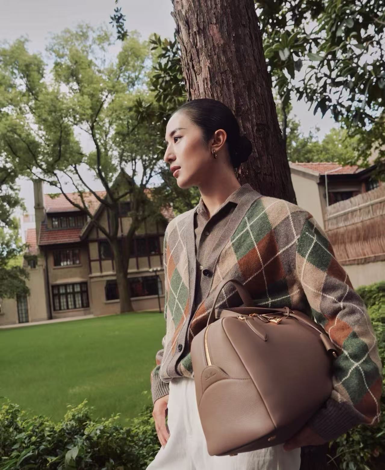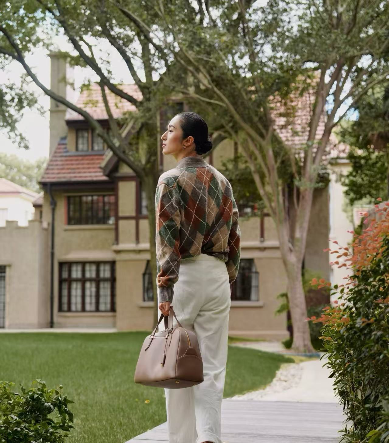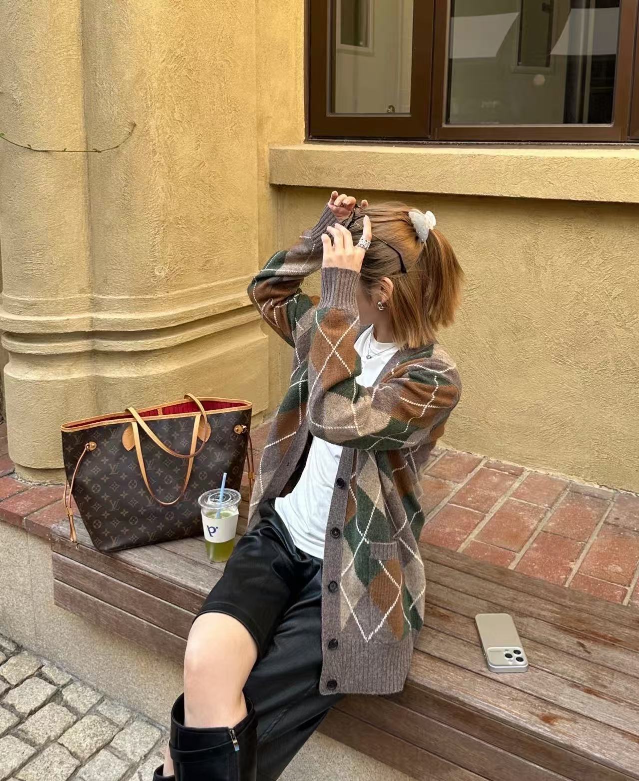 經典駝色夾花+菱格紋,復古又低調,陽光照下來層次超豐富,完全是那種靜靜站在那裡就很有故事感的單品,拍照真的無敵上鏡!
