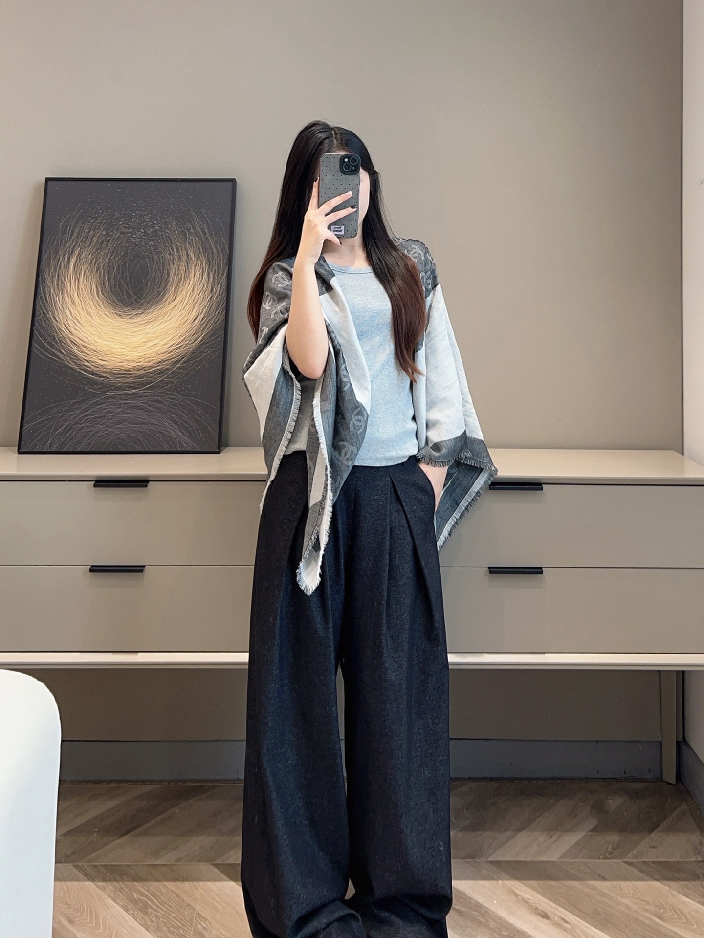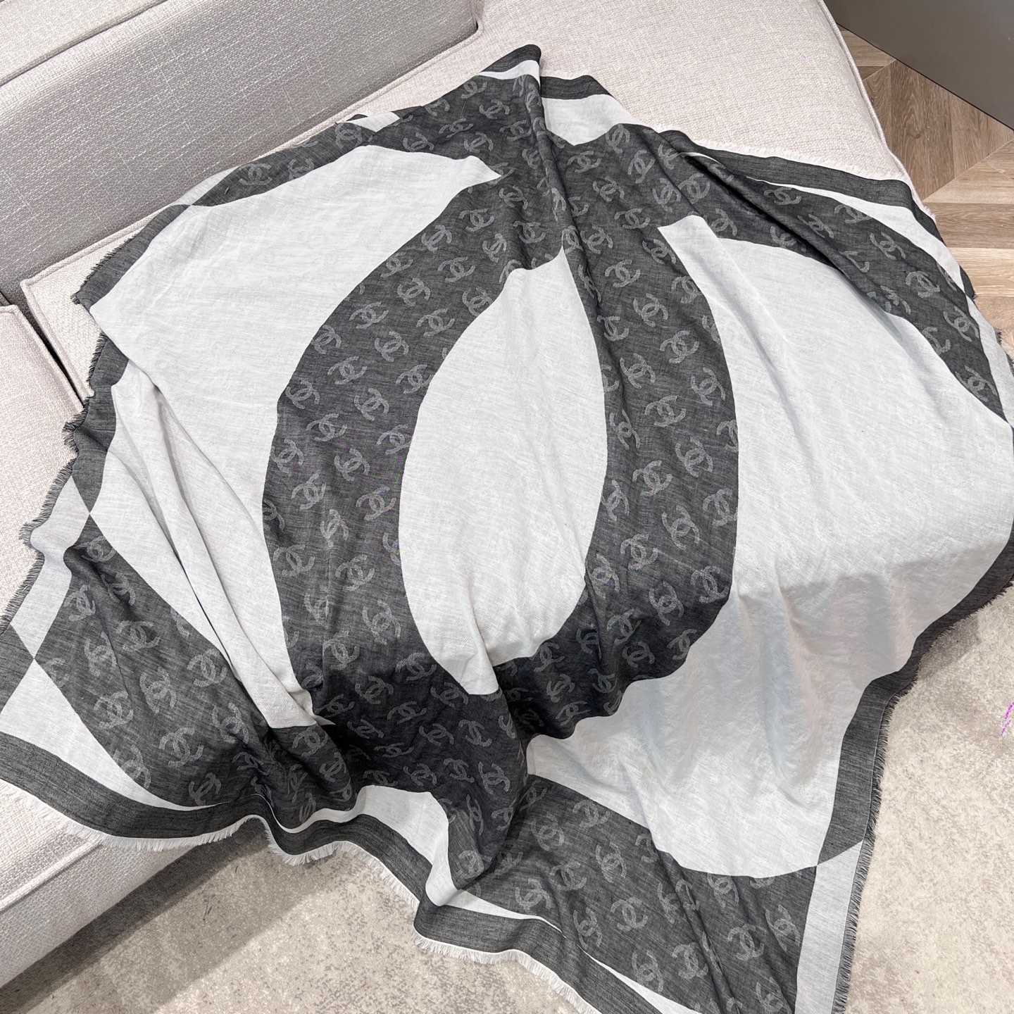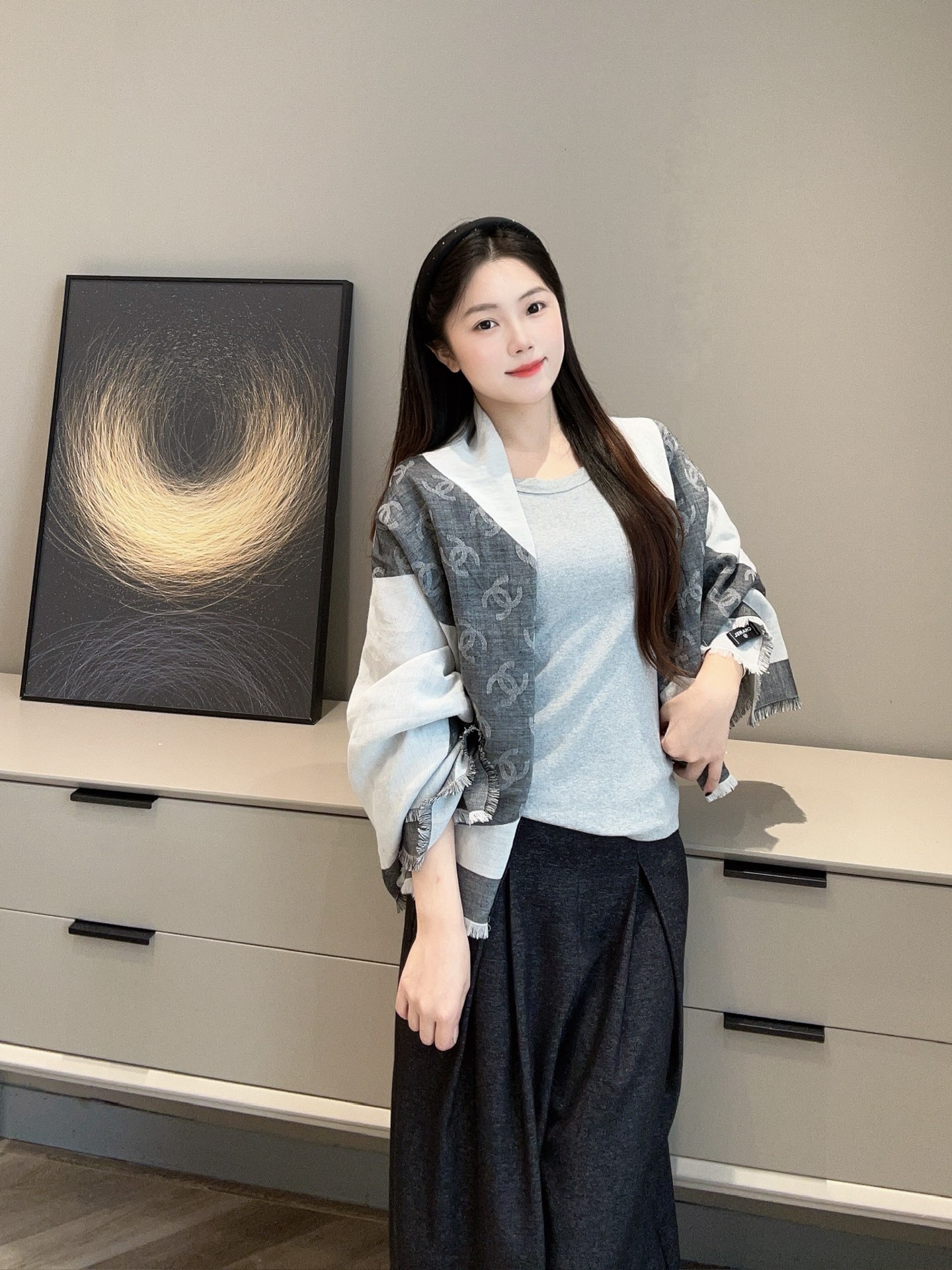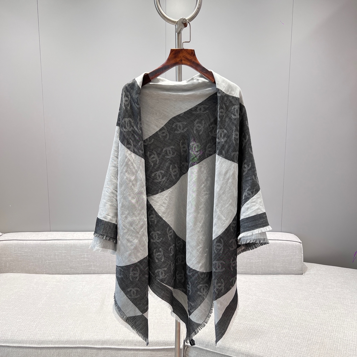 這條披肩真的美得太低調奢華!整體以灰白色調為主軸,乾淨又百搭,不論是冷冽冬日還是微風春秋,都能輕鬆融入日常穿搭中。