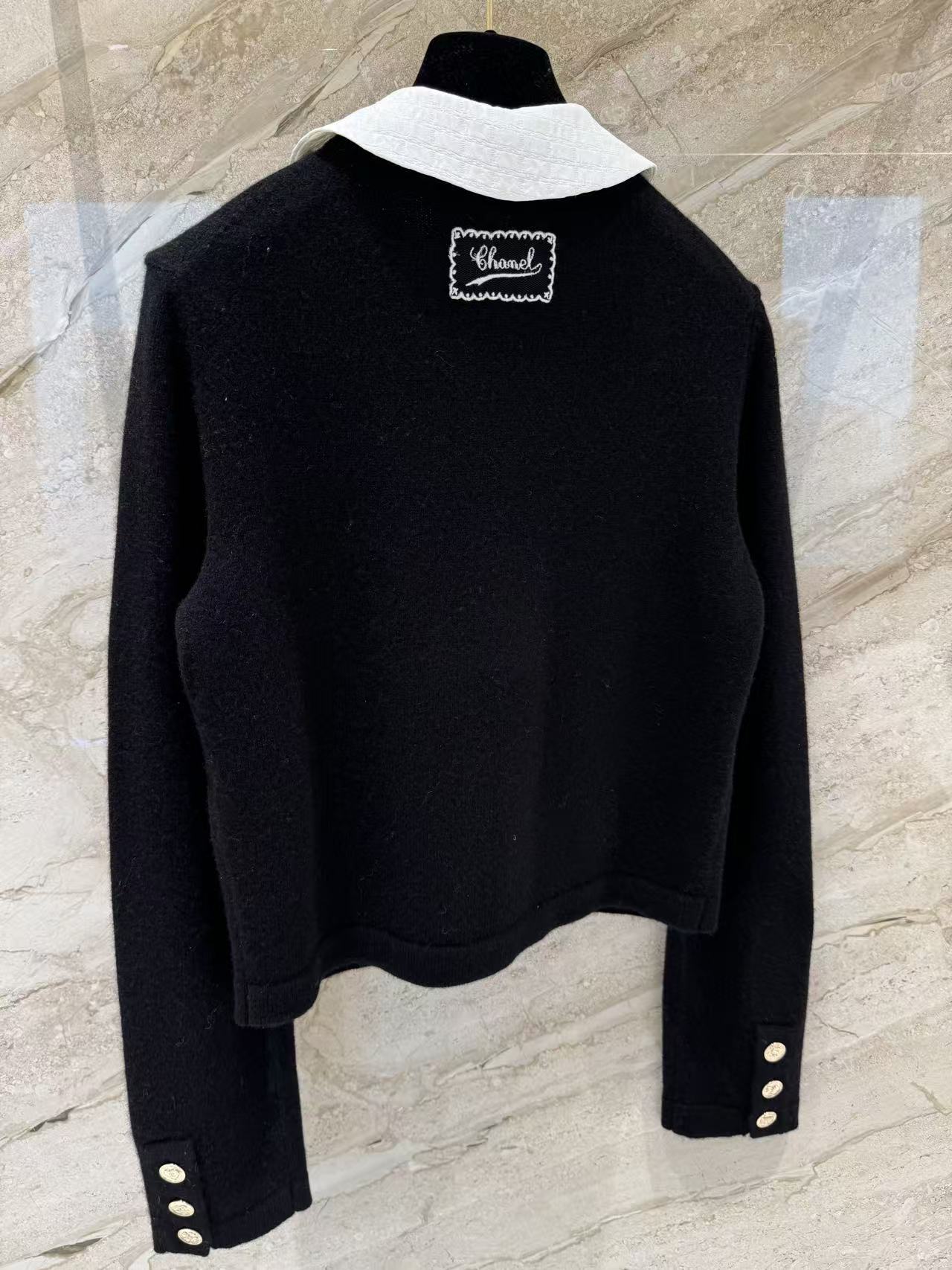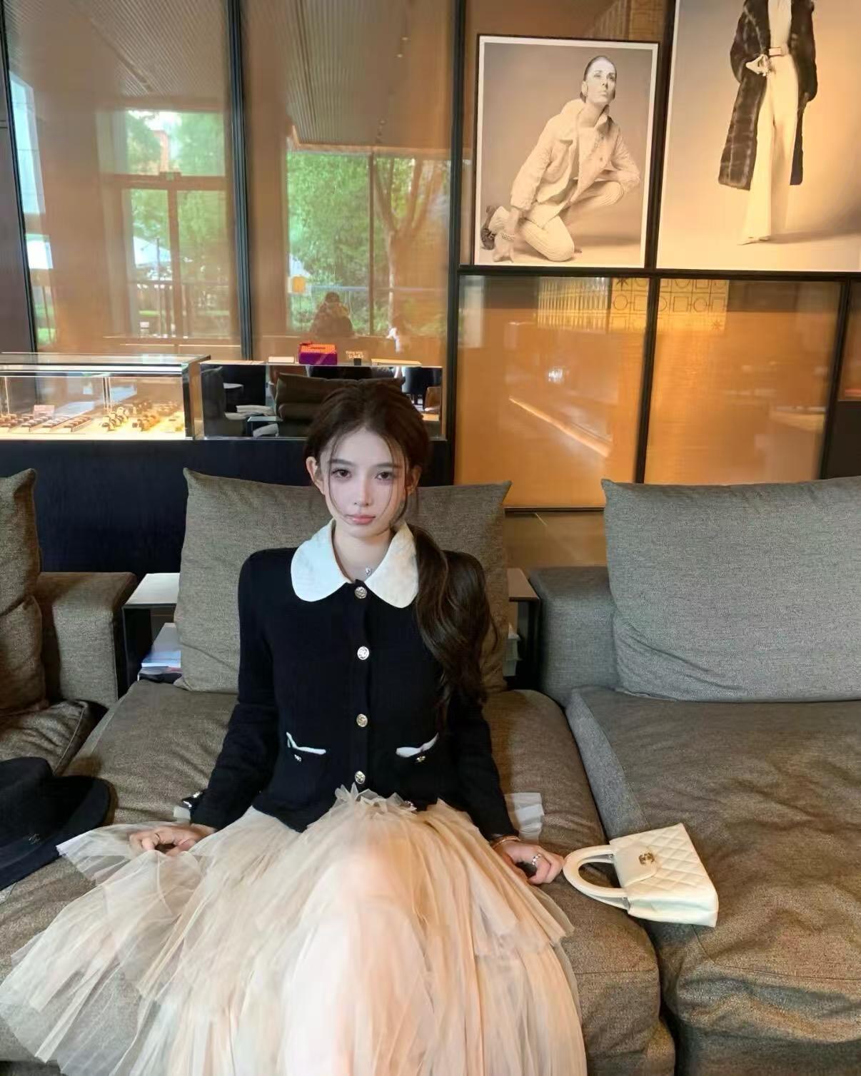 這款開衫最迷人的地方在於那片白色可拆卸娃娃領。裝上領子時,自帶一種法式學院風的減齡感;拆掉領子後,立刻切換成極簡大方的圓領開衫,風格變換隨心所欲。