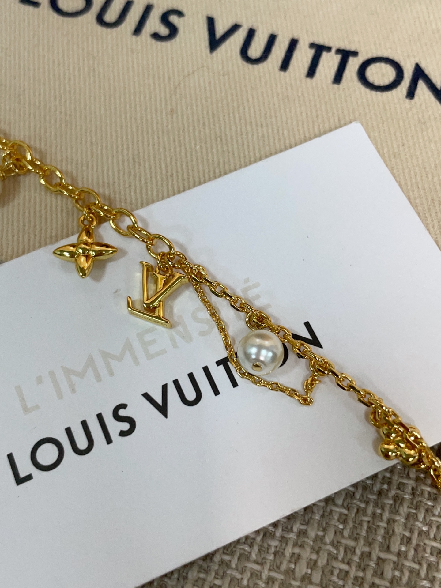 這條手鍊以珍珠搭配金花流蘇吊墜,細膩又富有動感,舉手投足間都有輕盈靈動的光澤。
