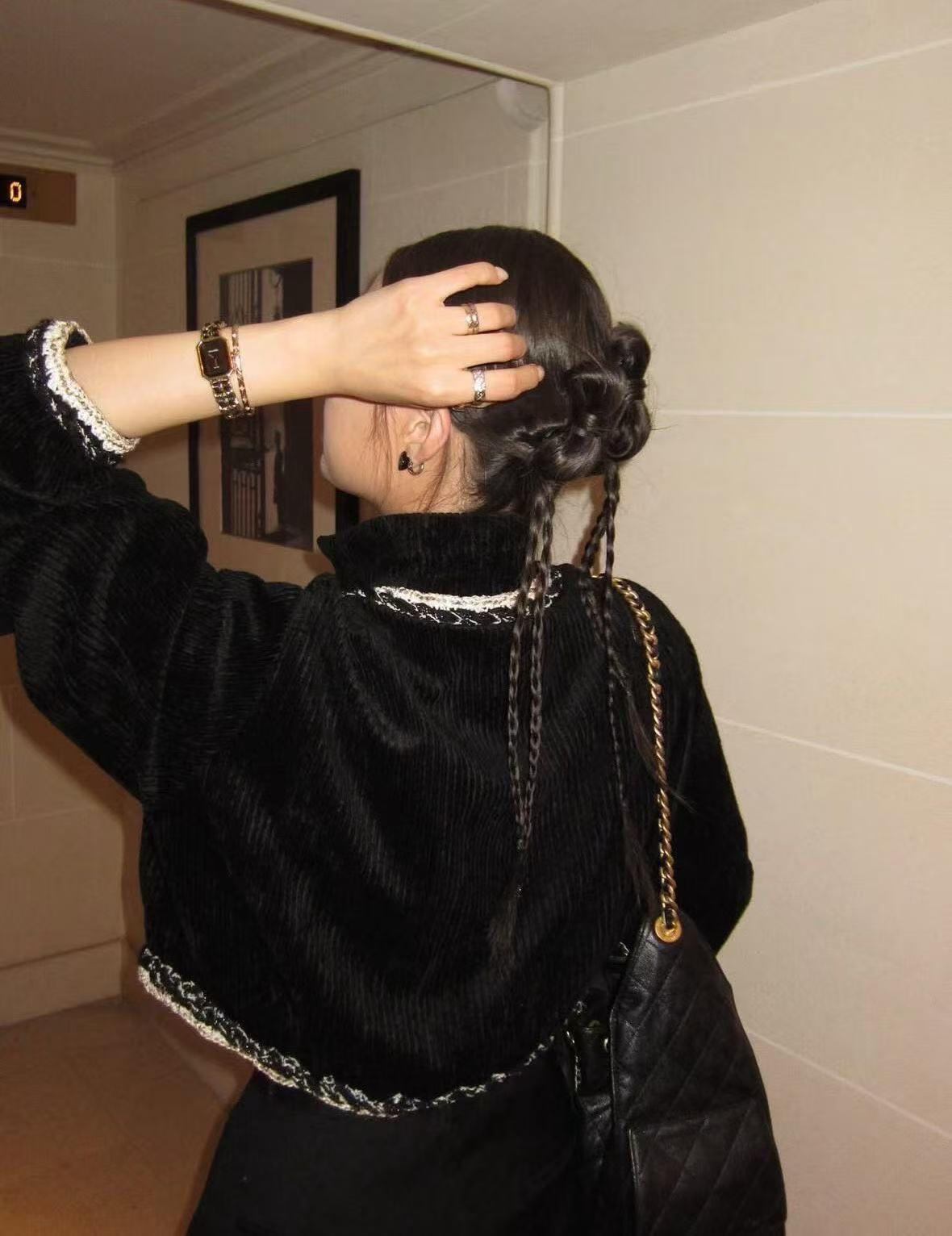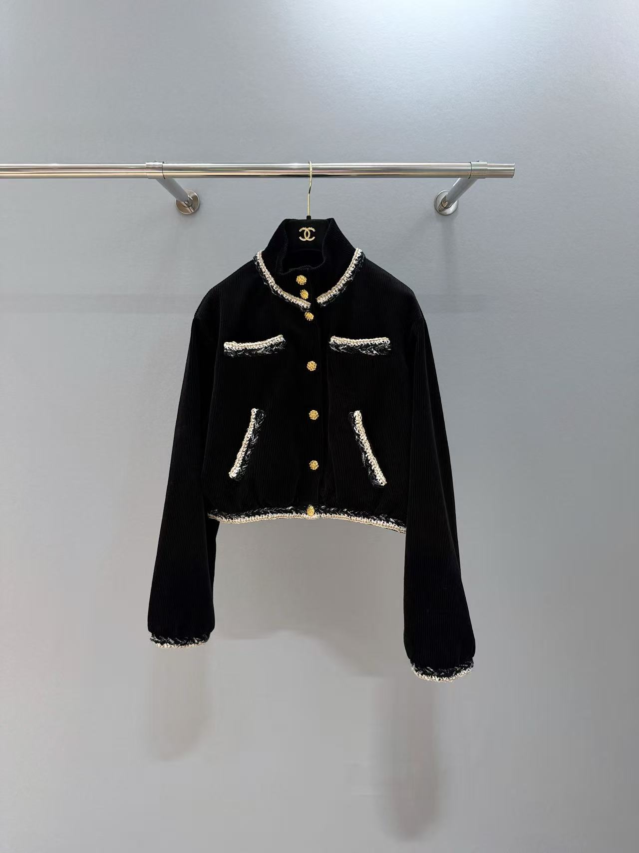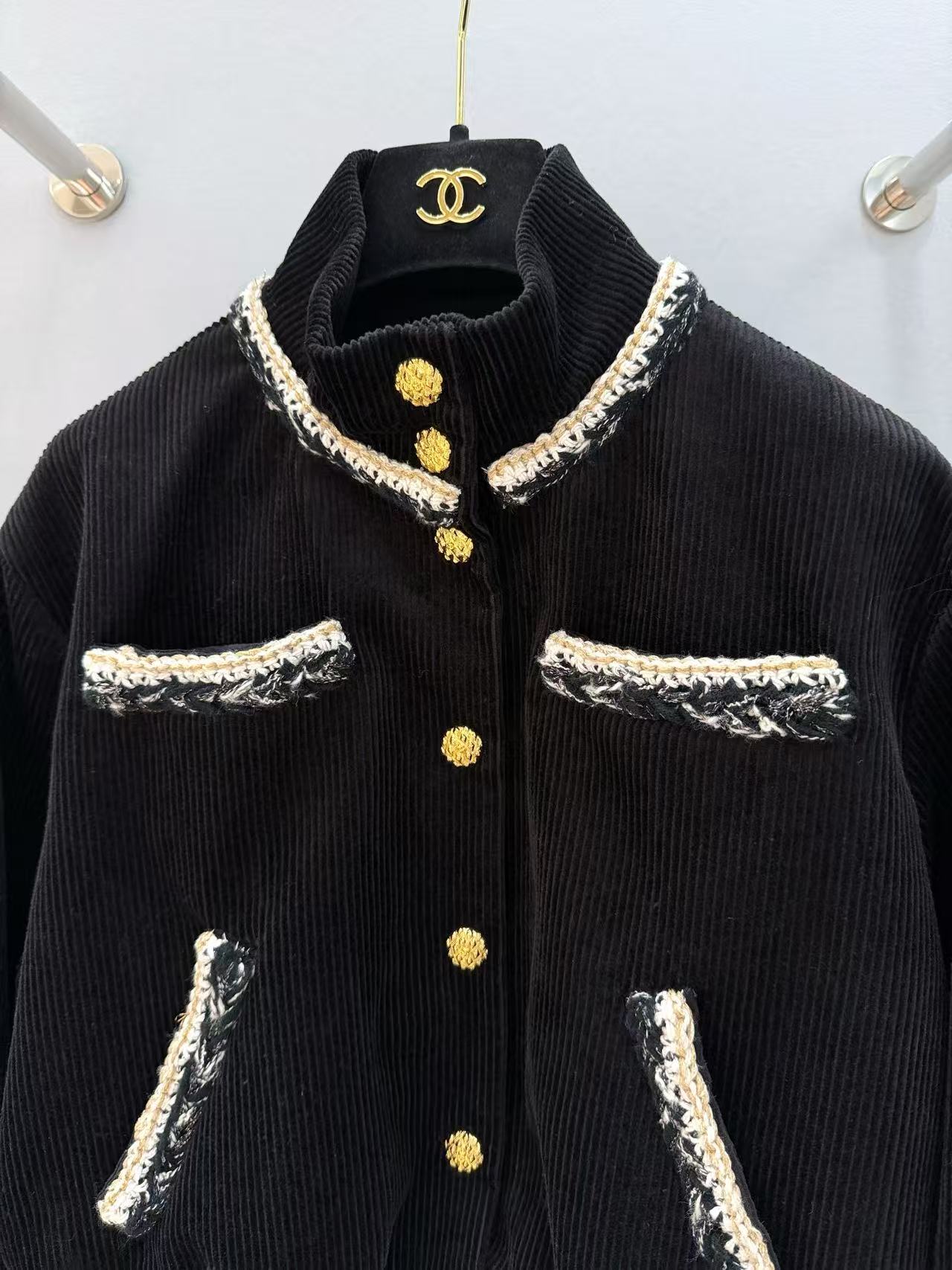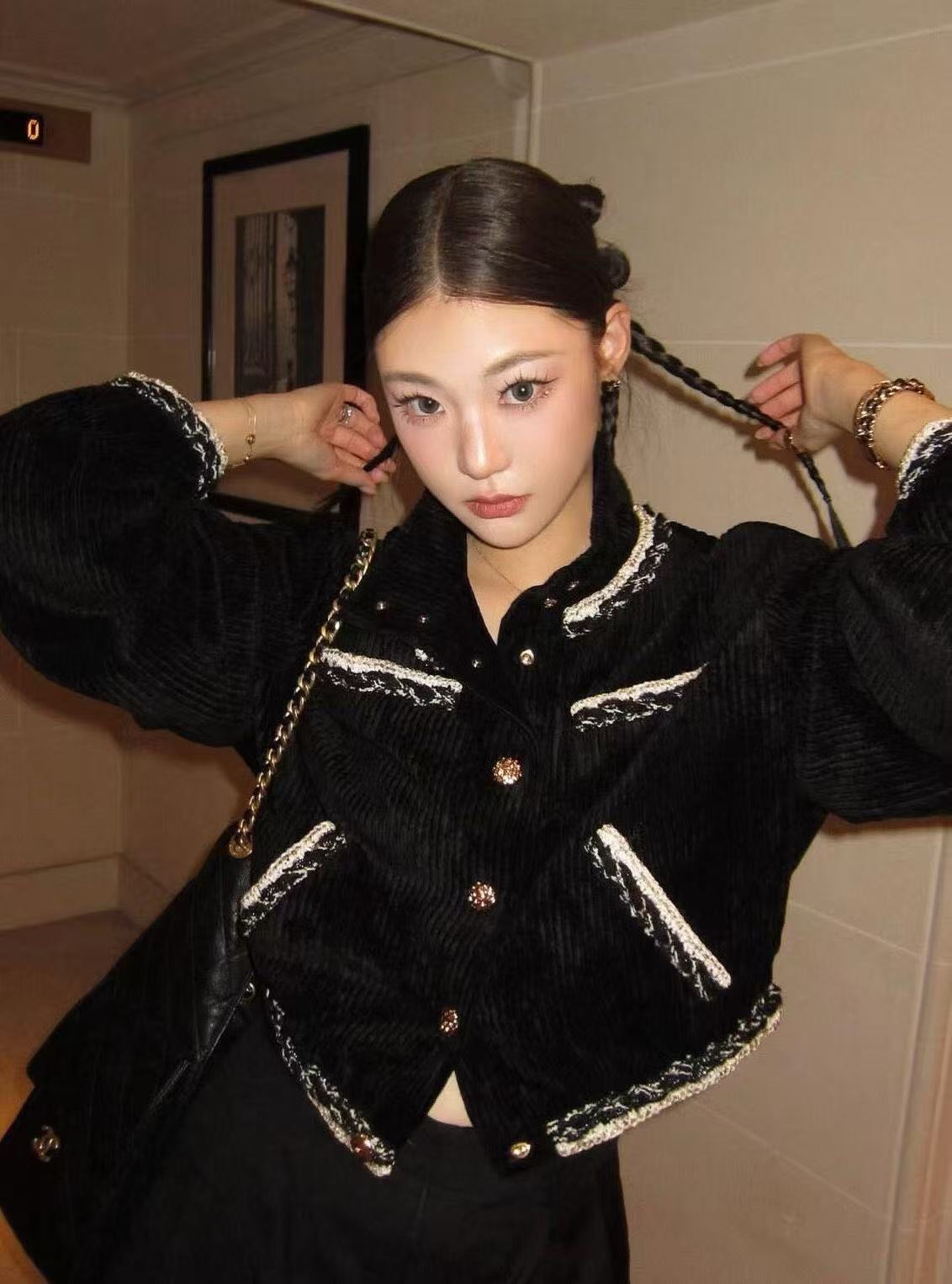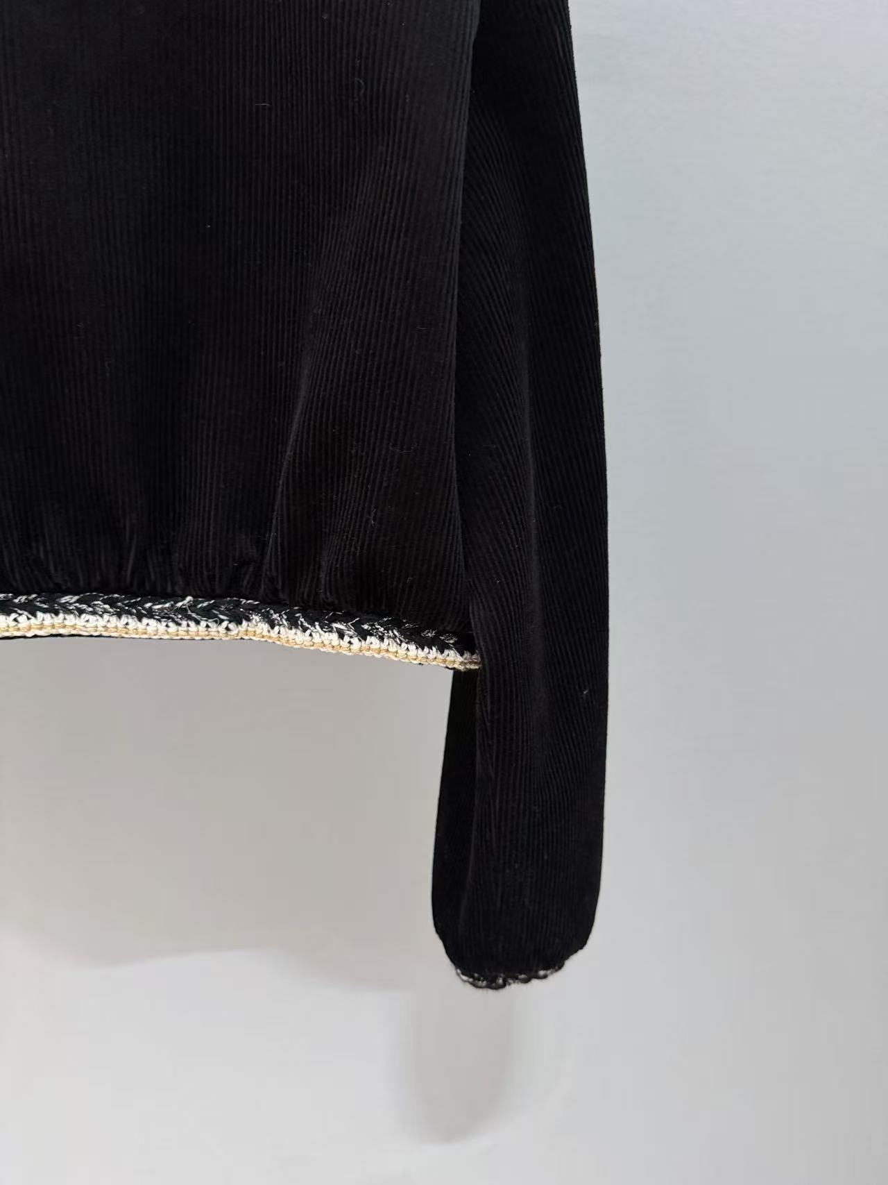 經典黑色燈芯絨底,帶著復古的慵懶霧面光澤,卻被那圈手工坊專屬「黑白金粗花呢滾邊」直接升華到天上!
