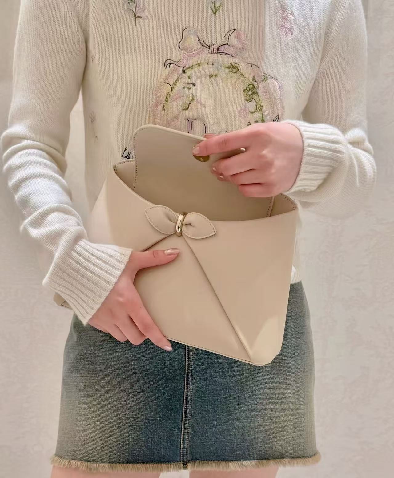 彩色的花卉刺繡並非平面的,而是帶有微立體感的電繡工藝,層次分明。蝴蝶結的線條流暢,將少女的甜美與精品的貴氣平衡得剛剛好。
