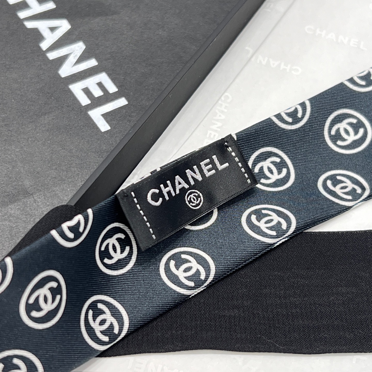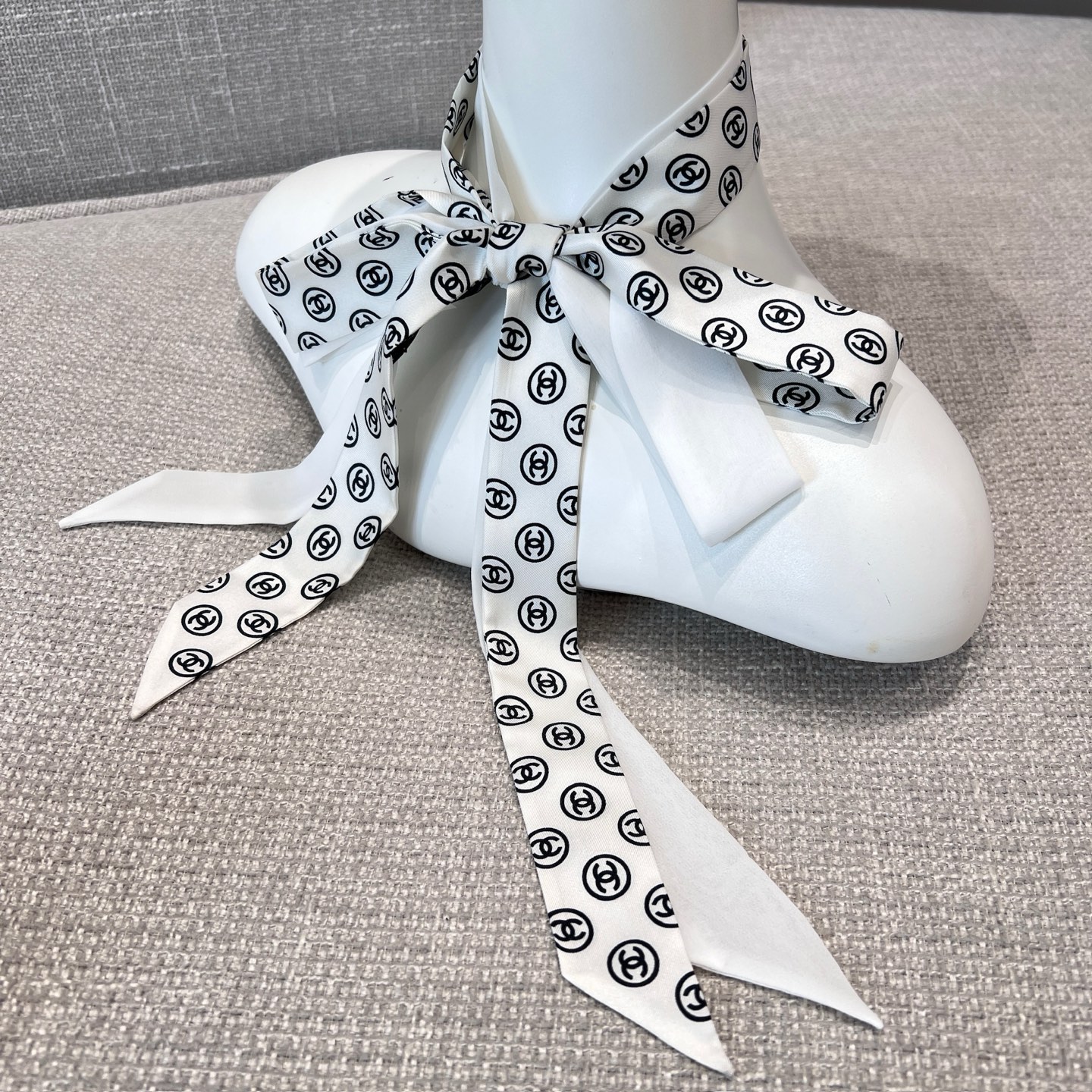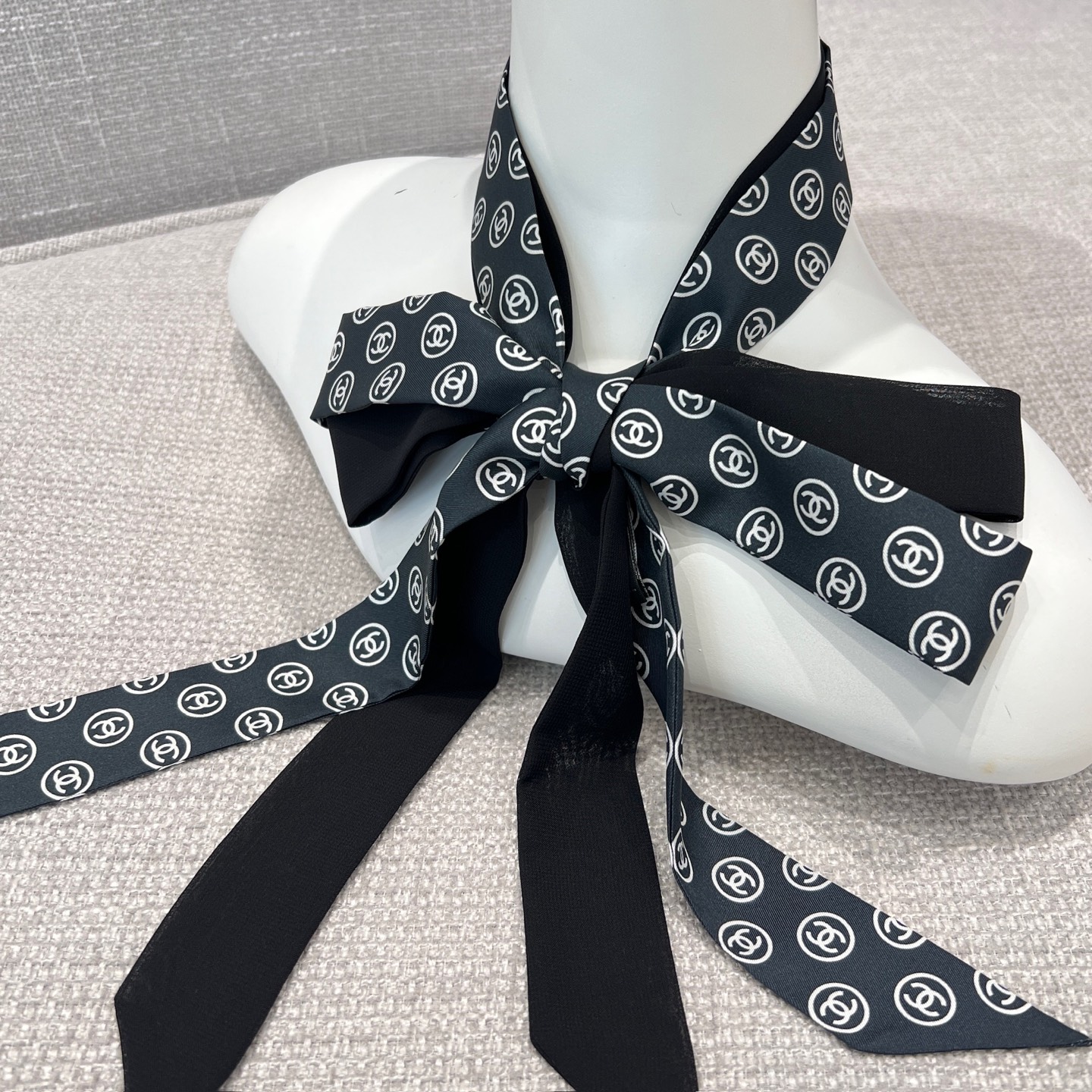 這款蝴蝶結長絲帶一看就很有記憶點,經典雙C Logo搭配細長版型,隨著走動自然擺動,讓整體造型多了點靈動感。