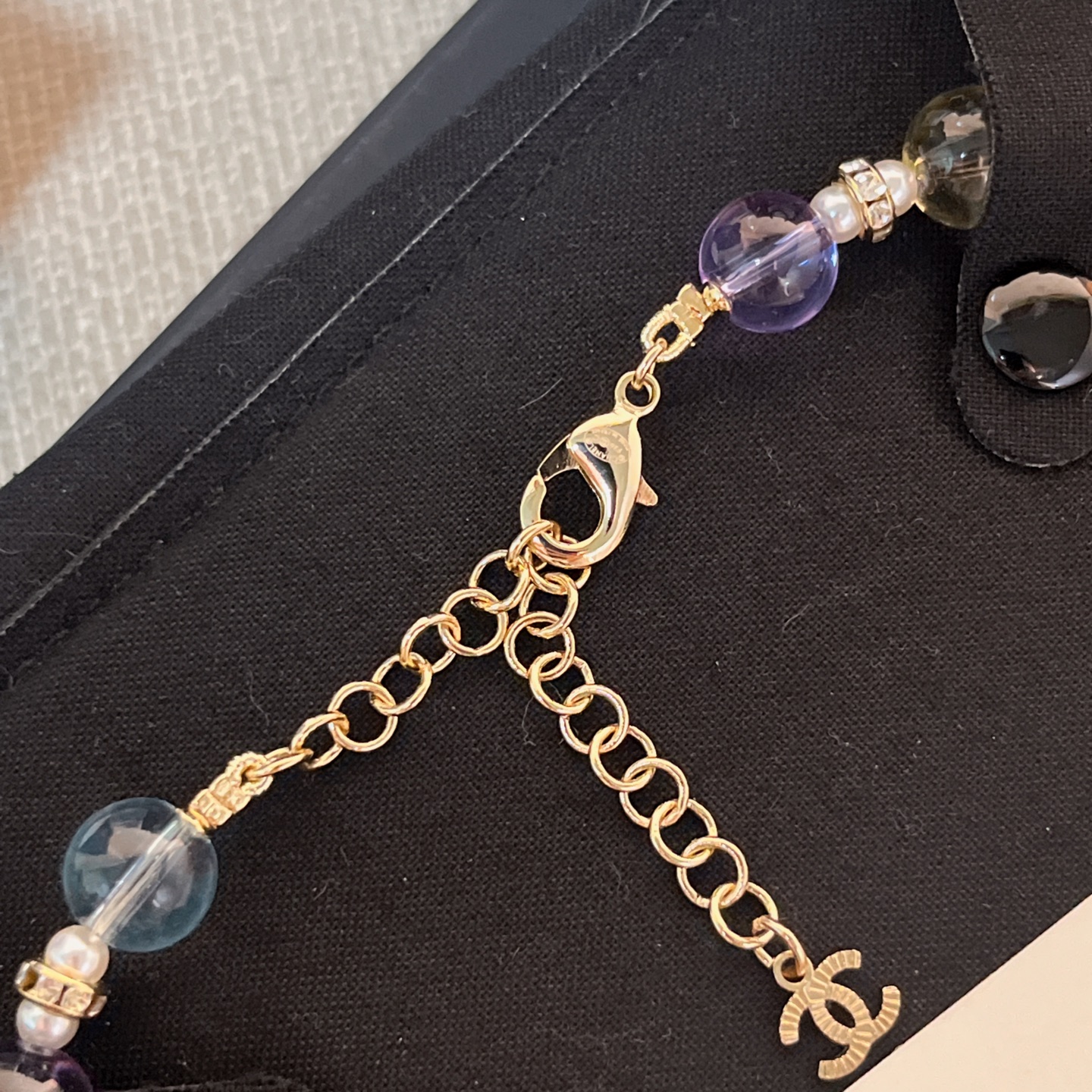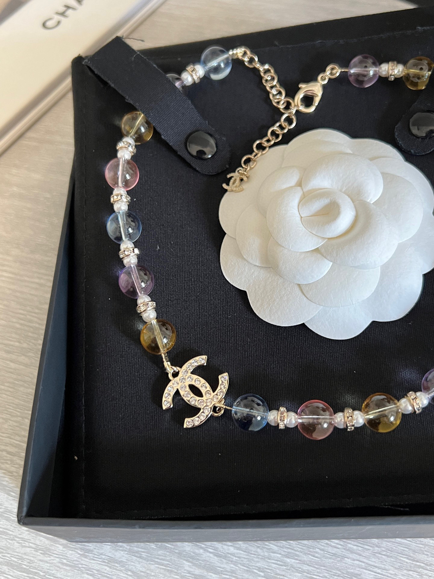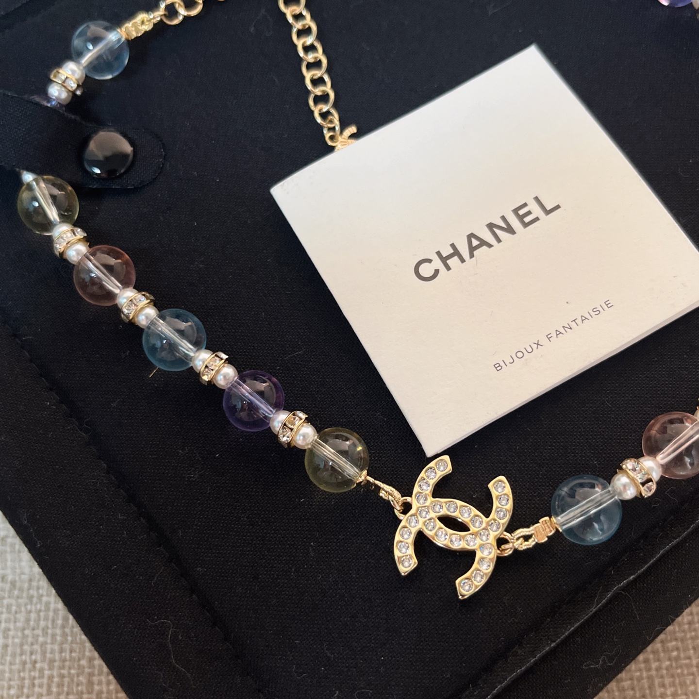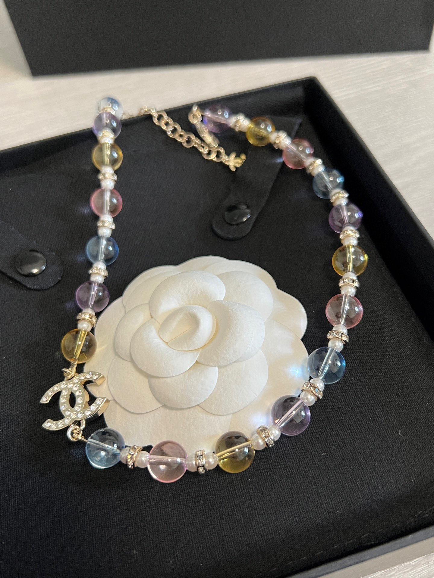整體設計以彩色水晶珠為主軸,搭配滿鑽雙C標誌,呈現出細膩又靈動的視覺效果,戴上瞬間讓整體造型多了一份精緻與層次感。